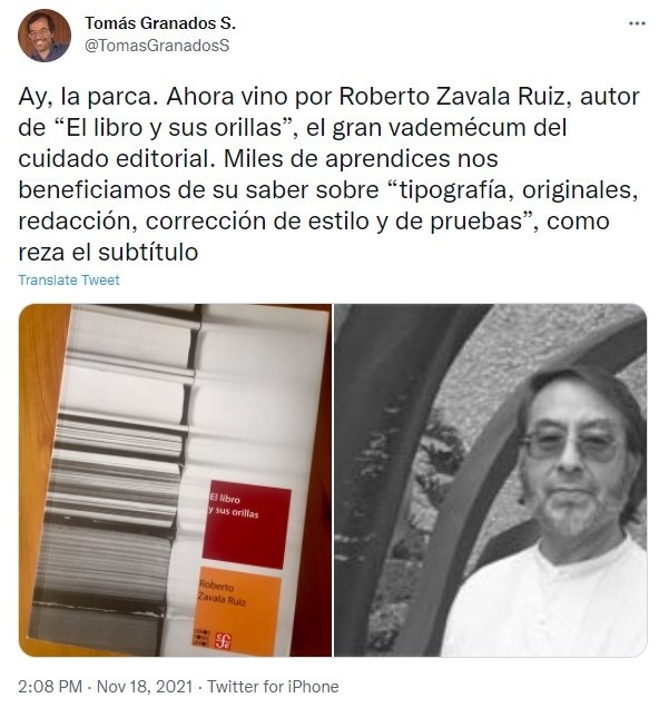 El escritor, editor y ensayista mexicano Roberto Zavala Ruiz, autor de "El libro y sus orillas. Tipografía, originales, redacción, corrección de estilo y de pruebas", murió este jueves y diversos alumnos, colegas y gremios de editores han lamentado la muerte del maestro que durante más de 40 años se dedicó con pasión a la producción de libros como corrector, editor y coordinador editorial.El editor Tomás Granados lamentó su deceso a través de su cuenta de Twitter: "Ay, la parca. Ahora vino por Roberto Zavala Ruiz, autor de 'El libro y sus orillas', el gran vademécum del cuidado editorial. Miles de aprendices nos beneficiamos de su saber sobre 'tipografía, originales, redacción, corrección de estilo y de pruebas', como reza el subtítulo".Escribió Granados que "De voz pausada e impoluta camisa de manta, lentes oscuros para que las erratas no sepan que está mirando, Roberto practicaba un humor anticuado, pero certero", y agregó que "El libro y sus orillas" está lejos de ser un árido manual sobre el correcto uso de la lengua o un refunfuñón catálogo de gazapos."Su exposición al grano, fruto de la experiencia y la reflexión sobre esa experiencia, sirve para que los neófitos sepan qué armas velar y para que los expertos contrasten opiniones o conozcan los porqués de algunas de sus prácticas. Decía Roberto que el título no sólo se refería al contenido, sino también al tratamiento: ‘ningún tema se agota, sino que más bien se bordea’", escribió el editor.Roberto Zavala Ruiz, nacido en 1949, fue egresado de la Facultad de Ciencias Políticas y Sociales de la Universidad Nacional Autónoma de México. Impartió cursos de redacción, corrección de estilo, técnicas de investigación documental y producción editorial en la UNAM, la Escuela Nacional de Antropología e Historia (ENAH) y en la Cámara Nacional de la Industria Editorial Mexicana (Caniem).Escribió en diversos periódicos y revistas como "Punto de Partida", "Los Universitarios", "Revista de la Universidad", "Hoja por Hoja", "Excélsior", "El Día" y "Manatí", entre otros. Fue director de la editorial Sans Serif Editores, productor del programa de divulgación literaria "Palabra en movimiento", transmitido por radio en la Universidad de Yucatán, y guionista de la serie "Luces del tiempo", coproducción del INAH e Imevisión.Tras conocerse la noticia, la Dirección de Publicaciones y Promoción Editorial de la Universidad Autónoma Metropolitana y la editorial de la Universidad de Guanajuato lamentaron el fallecimiento; al igual que el Seminario Permanente de Editores, que señaló "Lamentamos el sensible fallecimiento del gran Roberto Zavala Ruiz. Nos unimos a la pena de su familia y amigos, así como de la comunidad editorial, por esta irreparable pérdida".AF