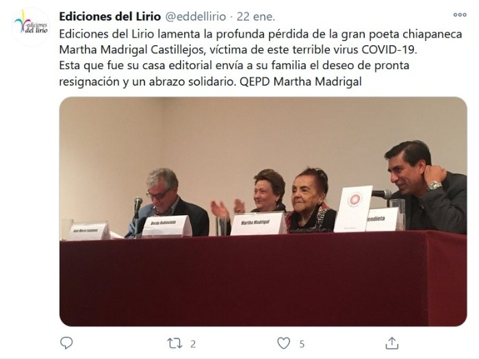 La poeta chiapaneca Martha Madrigal falleció este viernes a causa del Covid-19, informó a través de Twitter la editorial Ediciones del Lirio. Madrigal, nacida en Tuxtla Gutiérrez, Chiapas, en 1929, destacó por su poesía escrita en haiku. Fue autora de libros como "Cónclave de signos", el cual se publicó en 2020; "Haikais". "Me gusta escribir poesía", "Poesía mística", "Los chiquitillos" y "Décimas a la muerte".El director general de Ediciones Del Lirio, Marcos Daniel Aguilar, dijo que la poesía de Madrigal "es la memoria viva de lo que fuimos, pero también lo que seguimos siendo como cultura de la palabra". El editor Rubén Mendieta destacó la forma en que Madrigal conjugaba en sus versos diversas tradiciones líricas y momentos de la poética en español.En 2014, la escritora grabó un disco junto al flautista Horacio Franco titulado "Enamorada travesía". El flautista lamentó su muerte a través de su cuenta de Twitter. "Me ha dejado una infinita tristeza su partida, pero ha dejado un legado de poesía maravillosa que tanto me ha conmovido a mi como a quienes la admiramos por su enorme y prodigioso talento", escribió.JM
