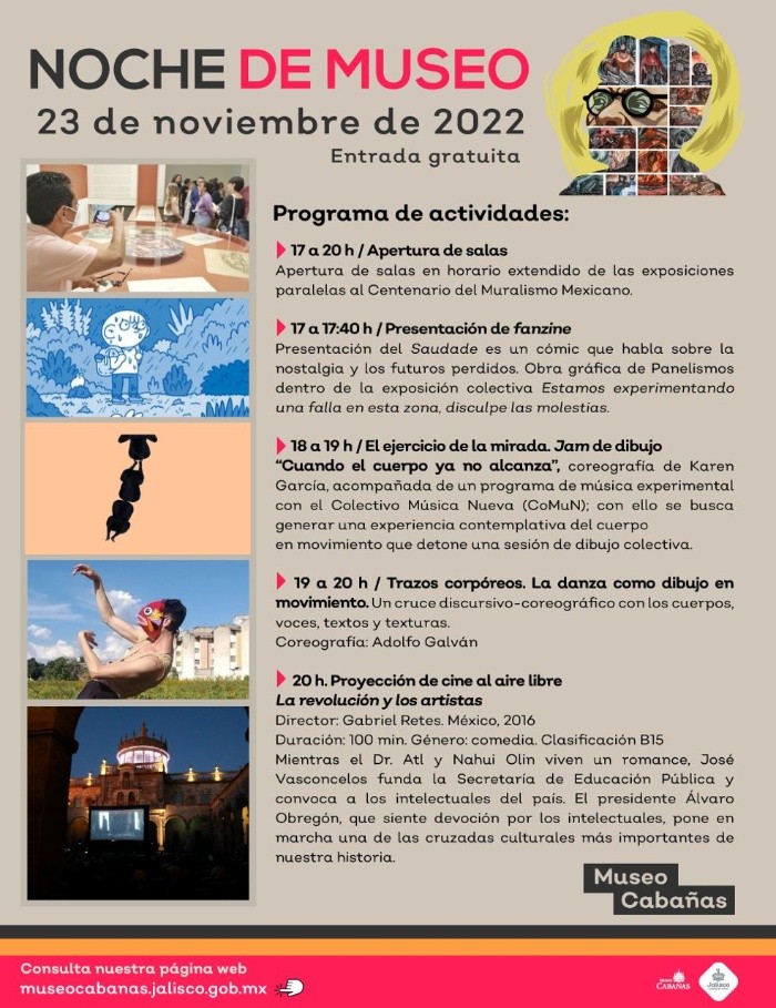 Con un horario extendido de salas, cine al aire libre, danza y música, todo con acceso libre, el Museo Cabañas celebrará el aniversario 139 del natalicio de José Clemente Orozco con una ‘Noche de Museos’, un programa para toda la familia este miércoles 23 de noviembre, de 17:00 a 21:30 horas.Este programa de actividades inicia a las 17:00 horas con la apertura de la Capilla Mayor y de las de las exposiciones paralelas al ‘Centenario del Muralismo Mexicano: Apoderarse de todos los muros. Anteproyectos de José Clemente Orozco’; lo mismo que ‘María Izquierdo. Entre sueño y presentimiento’, muestra curada por Brenda Caro Cocotle, que exhibe una importante pintura, además de documentos, fotografías y textos.Asimismo, se podrá admirar la muestra ‘David Alfaro Siqueiros. La construcción de lo público’, curada por Willy Kautz, Mónica Montes y Joel Pérez; con bocetos, documentos y fotomurales, así como pinturas de caballete y esculto-pinturas. Además, ‘Las épocas caleidoscópicas’ De Elsa-Louise Manceaux, paralela a la exposición ‘Apoderarse de todos los muros. Anteproyectos de José Clemente Orozco’; a la que se suma ‘La línea, la noche, armas del texto’, con obra de Florencia Guillén, donde deconstruye dibujos de mujeres hechos por Orozco.Ahora, a las 17:00 horas se presentará el fanzine ‘Saudade’ con obra gráfica de panelismos dentro de la exposición colectiva ‘Estamos experimentando una falla en esta zona, disculpe las molestias’. A las 18:00 horas inicia ‘El ejercicio de la mirada’ una sesión de dibujo colectiva a partir de la coreografía “Cuando el cuerpo ya no alcanza”, de Karen García. Asimismo, e Colectivo Música Nueva presenta un programa con piezas de Luis Pano, Felipe Quintero, Nabora Carrillo.De igual modo, a las 1:00 horas inicia ‘Trazos corpóreos. La danza como dibujo en movimiento’, una puesta en diálogo entre las artes vivas y las artes gráficas, con la dirección coreográfica de Adolfo Galván y los bailarines Adriana Quinto, Eduardo Magaña Núñez, Verónica Díaz, Tania Díaz Talamantes, Luis Gallegos "Posh", Antonio González, Héctor Torres, Adolfo Galván y Cinthia Landazury. Finalmente, a las 20:00 horas, se proyecta la cinta mexicana ‘La revolución y los artistas’ (2016), dirigida por Gabriel Retes.Para estar al tanto de lo que sucede en el Museo Cabañas (Calle Cabañas 8/ Colonia Las Fresas/ Plaza Tapatía/ Guadalajara), puede consultar sus redes sociales en Facebook, Instagram, Twitter (@museocabanas), YouTube, Spotify, Telegram (Museo Cabañas) o la página web oficial del recinto (museocabanas.jalisco.gob.mx).MF