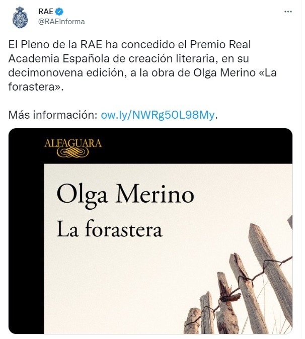 A través de un comunicado que se publica este jueves 13 de octubre, se informa que el Pleno de la RAE ha concedido el Premio Real Academia Española de creación literaria, en su decimonovena edición, a la obra de Olga Merino ‘La forastera’, cuya candidatura fue presentada por los escritores y académicos Mario Vargas Llosa, José María Merino y Carme Riera.Así, de acuerdo con lo que dispone su reglamento, en la convocatoria correspondiente a 2022, el premio se concede a una obra de creación literaria, que debe haber sido publicada en los dos años inmediatamente anteriores al de la concesión.De igual modo, no está permitido presentar obras previamente publicadas, aunque la nueva edición sea corregida y aumentada; además, el premio tiene una dotación económica de 20 mil euros, que se entrega junto con una medalla conmemorativa.En este sentido, de las once candidaturas —cada una avalada por un mínimo de tres académicos numerarios de la RAE o de cualquiera de sus academias correspondientes, así como por alguno de los ganadores de convocatorias anteriores—, cuatro proceden de España, seis de corporaciones americanas (las de Chile, Perú, México y Ecuador) y una de anteriores galardonados con el premio.A través de la Fundación Premios RAE, la Academia instituyó en 2003 el Premio Real Academia Española con el objetivo de fomentar los estudios y trabajos que de manera señalada contribuyen al mejor conocimiento de la lengua y la literatura españolas; así, el galardón se concede, en años alternos, a una obra de creación literaria en cualquiera de sus géneros y a una obra de investigación filológica general o hispánica.Finalmente, Olga Merino (Barcelona, 1965) es una escritora y periodista conocida por su trabajo de corresponsal en Moscú durante la caída del régimen soviético. Tras estudiar Ciencias de la Información, realizó un máster especializado en Historia y Literatura Latinoamericana en el Reino Unido. Ha vivido entre Londres y Moscú; en este último trabajó durante cinco años como corresponsal para El Periódico de Catalunya (donde continúa publicando crónicas culturales y artículos de opinión).En lo literario, Merino debutó en 1999 con la novela ‘Cenizas rojas’; cinco años después publicó ‘Espuelas de papel’, pero fue su relato ‘Las normas son las normas’ el que le ganó reconocimiento. Ahora se alza con este premio gracias a ‘La forastera’ (2020). Su más reciente libro es ‘Cinco inviernos’ (2022).MF
