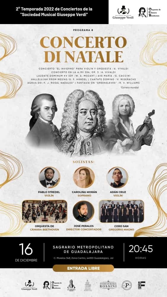 A punto de concluir este 2022 y la Sociedad Musical Giuseppe Verdi, que a través de 14 conciertos en este lapso ha acercado la música formal a los tapatíos, persigue cerrar sus actividades con la celebración este próximo viernes 16 de diciembre de un concierto –el número 15 de 2022– que se titula ‘Concerto di Natale’ y en el que participan la Orquesta de Cámara Beethoven (OCB), el Coro San Gregorio Magno y tres solistas, dirigidos por la batuta de José Perales, con lo que finalizará la segunda temporada del año.Este concierto invernal se llevará a cabo en la sede de la Orquesta de Cámara Beethoven, el Sagrario Metropolitano (Morelos 348, Centro Histórico, GDL), donde a partir de las 20:45 horas se podrán escuchar ocho piezas, con un estreno mundial incluido, cuya temática principal será la temporada invernal y la Navidad.Se trata del octavo programa para esta temporada (que ha sido la más extensa en lo que lleva la Sociedad Musical Giuseppe Verdi promocionando conciertos); la temática es un concierto invernal, y aunque nombre es ‘Concerto di Natale’, es ante todo una presentación donde se busca evocar diferentes estados de ánimo, precisamente relacionados con la época de fin de año.El repertorio para esa noche incluye piezas de Vivaldi, Mozart, Caccini, Händel, Rosal Nadales, Miserachs y Williams; un programa diverso que se conforma por compositores muy diversos, desde el Barroco hasta contemporáneos. De las ocho piezas, sólo una es completamente instrumental, la ‘Fantasía sobre Greensleves’, de Ralph Vaughan Williams, de quien se festeja el 150 aniversario de su nacimiento. Aunado a tres piezas corales, se ejecutará también el estreno mundial de ‘Agnus Dei’, del compositor español Francisco José Rosal Nadales, miembro de la Sociedad Musical Giuseppe Verdi.Finalmente, participan en el concierto tres solistas que interpretan cuatro obras. Dos violinistas, un joven violín primero de la orquesta, Adán Cruz, quien interpreta el ‘Concierto en La Menor’, de Vivaldi; la otra obra para violín será el ‘Concierto en Fa Menor’ –es decir, “El Invierno”, de ‘Las Cuatro Estaciones’–, de Vivaldi, que tocará el concertino Pablo Stredel. Finalmente, la soprano Carolina Morán cierra el programa con el ‘Laudate Dominum’, de Mozart, y el ‘Ave María’, de Giulio Caccini.La cita para el ‘Concerto di Natale’ es este viernes 16 de diciembre a las 20:45 horas. La entrada en el Sagrario Metropolitano es libre, por lo que se recomienda llegar desde las 20:00 horas.MF