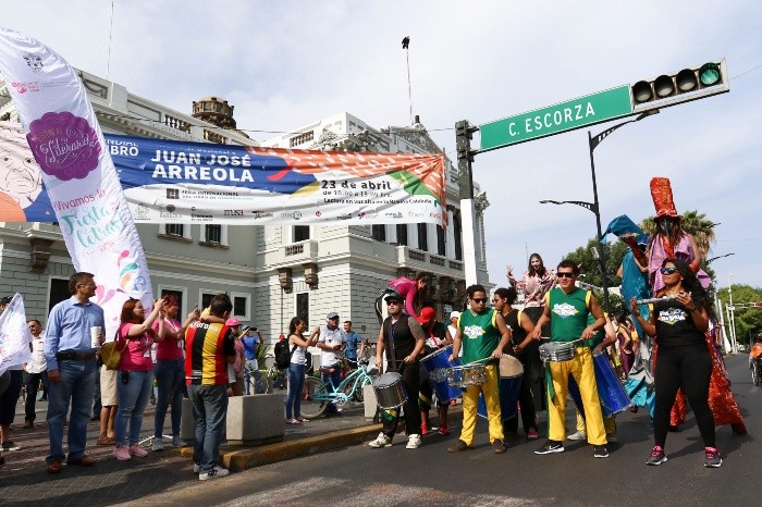 Al ritmo de batucada, personajes y carros alegóricos alusivos a la literatura como La Odisea, de Homero, Los viajes de Gulliver, de Jonathan Swift, Pedro Páramo, de Juan Rulfo, y otros, invadieron, el pasado domingo las calles del centro de Guadalajara para el disfrute de centenares de niños, padres y asistentes a la Vía RecreActiva, quienes también gozaron con los actos de acróbatas y cirqueros.Entre el alboroto de ciclistas, las miradas y celulares de los reunidos, y la atenta sonrisa de los más pequeños, se realizó la segunda edición del Festival Literario ¡Vivamos la fiesta de las letras!, organizado por la Universidad de Guadalajara (UdeG), en el que participaron estudiantes de preparatoria y centros universitarios con 30 carros, así como atuendos alusivos para desfilar desde las 10:15 horas, partiendo de la Rambla Cataluña a la Plaza Liberación.El coordinador de Bibliotecas de la UdeG, Sergio López Ruelas, destacó la labor del Programa Universitario de Fomento a la Lectura “Letras para Volar”, que organiza este festival, una de las aportaciones más inspiradoras, en la que jóvenes, estudiantes y profesores se encuentran en un acto lúdico y vivencial que favorece el diálogo, la educación, la creación de ciudadanos, a través de la lectura dentro y fuera de la Universidad."Y que adquiere con ello un liderazgo indiscutible en el ámbito nacional con la cobertura de más de 160 mil niños y jóvenes que se han beneficiado de este programa. Celebramos juntos a todos los participantes ser parte de este evento, que esperamos contagie el amor por la lectura", subrayó López Ruelas.La coordinadora de Innovación Educativa y Pregrado (CIEP) de esta Casa de Estudio, Patricia Rosas Chávez, tras destacar la afluencia de asistentes, expresó su entusiasmo porque los niños de la ciudad disfruten de la lectura a través de juegos y acercamientos divertidos, que no los obligue y no lo sientan como una actividad tediosa."Estos carritos son producto de la creatividad de los estudiantes y profesores (quienes) hicieron una labor extraordinaria, y los promotores de lectura, leyendo a lo largo del año, y luego escogieron la obra que más les gustó y decidieron representar", apuntó Rosas Chávez.Además de la exhibición de carros, universitarios y escritores como los poetas Carmen Villoro y Jorge Souza Jauffred, el académico Alfredo Tomás Ortega Ojeda, entre otros, dieron lectura a fragmentos de obras de varios escritores. También se realizaron talleres de cuentacuentos, dibujo y se premiaron a los carros alegóricos ganadores.JB