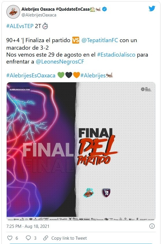 En actividad de la Jornada 4 de Liga de Expansión MX, Tepatitlán venció a los Alebrijes en condición de visitante con un marcador final de 3-2, para así llevarse los cuatro puntos del Estadio del Instituto Tecnológico de Oaxaca.Juan David Angulo adelantó a los jaliscienses al minuto 13, con un gran disparo desde fuera del área que se colgó prácticamente en la horquilla. Oaxaca siguió adelante, y consiguió pronto el empate; al 24', los oaxaqueños metieron un balón al travesaño tras un centro en tiro libre, y en recentro, Julio César Cruz aprovechó para guardar la esférica con un potente tiro. Al 54', Lizandro Echeverría dio la voltereta para los locales. En un tiro de esquina, Echeverría aguantó al segundo poste para quedar solo y disparar a plenitud; sin embargo, los Alebrijes se quedaron en el festejo… Apenas tres minutos después, Víctor Omar Mañón remató de cabeza superando a la marca en el área, y así empatar el encuentro.Con la crecida anímica, el mismo Mañón aprovechó tras una mala salida del arquero; el balón quedó botando en el área y con el arquero tendido en el césped disparó sin dificultad para firmar su doblete. Tepatitlán cerró el candado y bloqueó cualquier oportunidad para un empate.¿Quieres saber más?Si quieres tener más contenido, más imágenes y aún más noticias, entonces descarga INFORMAPlus, la aplicación digital de EL INFORMADOR, donde tenemos materiales exclusivos para ti. Descarga la aplicación y pruébala GRATIS por treinta días. Para iOS: https://apple.co/35jaVgbPara Android: https://bit.ly/3gwVSEVSi eres suscriptor de EL INFORMADOR tu acceso está incluido, solicítalo al 33 3678-7777 AA