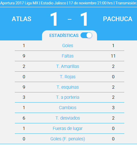 Los rojinegros del Atlas igualaron hoy en casa al Pachuca por marcador 1-1, con lo que tendrán que esperar el resultado de los partidos de mañana entre Cruz Azul y Veracruz y el de Necaxa y Morelia para saber si lograrán acceder a la Liguilla del Apertura 2017.Para pasar a la fase final los Zorros necesitan que la Máquina no derrote a los escualos y si lo hace, que Necaxa no gane o empate ante los Monarcas. Una victoria de los Cementeros combinada con un triunfo o empate de los Rayos dejarían a la Academia fuera de la Liguilla.El tanto de los Zorros ante Pachuca fue anotado por Madueña al minuto 45, y los Tuzos respondieron con un gol de Robert Herrera a unos segundos del final del partido.LEE: minuto a minuto- Atlas vs PachucaEn la primera parte, Atlas tomó la iniciativa a la ofensiva y tuvo mayor posesión de balón, pero los Tuzos lograron crear serio peligro en acciones de contragolpe.Los visitantes se vieron obligados a realizar un cambio al minuto 17, cuando Erick Gutiérrez tuvo que abandonar la cancha tras una aparatosa falta del rojinegro Tabó que encendió los ánimos en el plantel visitante.Con Keisuke Honda como su principal arma ofensiva, Pachuca logró vulnerar la defensa de Atlas, que mantuvo el cero solo gracias a un par de buenas intervenciones del portero Miguel Fraga.Parecía que los Zorros tendrían que resignarse a concluir la primera parte con la paridad sin goles, pero se hizo presente la clase de Rafael Márquez, que puso un centro templado sobre el punto de penalti para que Madueña colocara de cabeza el 1-0 justo antes del silbatazo de medio tiempo.En la segunda mitad los rojinegros se limitaron la mayor parte del tiempo a contener a un Pachuca poco inspirado, que generó poco peligro a la ofensiva. Los Zorros no finiquitaron el partido cuando pudieron, y lo pagaron recibiendo un gol de Herrera que pone en riesgo su pase a la Fiesta Grande.Los Zorros se colocan momentáneamente en séptimo lugar general, aunque su posición podría cambiar con el resto de los partidos del fin de semana. Así, los rojinegros cierran la fase regular del Apertura 2017 con un balance de 25 puntos, producto de siete victorias, cuatro empates y seis derrotas.ALINEACIONESATLAS (4-2-3-1): Fraga, Márquez, Arreola, Vigon (Alustiza, 70'), Madueña, Reyes, Salas, Garnica, Tabó, Caraglio, Barreiro, D.T. José Guadalupe CruzPACHUCA (4-2-3-1): Pérez, Martínez, Hernández, García, Gutiérrez (Sánchez, 17'), Guzmán, de la Rosa (Aguirre, 66'), Herrera, González, Sagal (Cano, 73'), Honda, D.T. Diego AlonsoÁRBITRO: Fernando Hernández Gómez