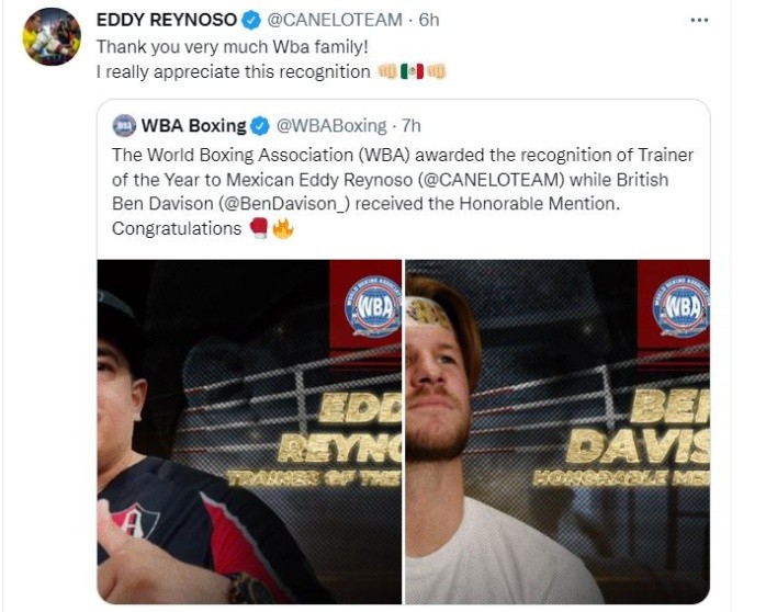 El manager de Saúl "Canelo" Álvarez, Eddy Reynoso, no para de recibir reconocimientos luego de que fuera galardonado en 2021 como Entrenador del Año por el Consejo Mundial de Boxeo (CMB) y por la publicación especializada, The Ring Magazine.En esta ocasión Reynoso fue reconocido como Entrenador del Año por la Asociación Mundial de Boxeo (AMB), quien felicitó al manager a través de sus redes sociales."La Asociación Mundial de Boxeo otorgó el reconocimiento de Entrenador del Año al mexicano Eddy Reynoso mientras que el británico Ben Davison recibió la Mención de Honor. Felicitaciones", informó el organismo vía redes sociales.Posteriormente fue Eddy Reynoso quien agradeció el reconocimiento. "¡Muchas gracias familia WBA! Realmente aprecio este reconocimiento".Después de convertirse en el monarca absoluto de los supermedianos, luego de noquear al estadounidense Caleb Plant, Saúl "Canelo" Álvarez ya tiene en la mira su siguiente objetivo para 2022, se trata del campeón de peso crucero del CMB, Ilunga Makabu, nacido en el Congo.Eddy Reynoso, manager del 'Canelo' hizo la petición durante la convención del CMB, que se realizó en la Ciudad de México en noviembre de 2021."Como representante del 'Canelo' estoy aquí para levantar la voz y pedirle al Consejo Mundial de Boxeo la siguiente pelea para 'Canelo', y buscar al campeón crucero, Ilunga Makabu, que nos dé la oportunidad de buscar la pelea con el campeón inmediata, después de que unificamos los títulos de las 168 (libras)", señaló Reynoso.JL