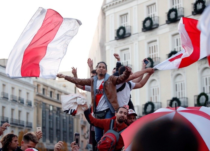 Aficionados de River Plate y Boca Juniors brindaron este sábado un último aliento a sus equipos con sendos banderazos en Madrid, donde el domingo a las 19:30 horas GMT disputarán el segundo partido de la final de la Libertadores.Entonando cánticos acompañados por un ruidoso bombo, cientos de hinchas millonarios tiñeron de blanco y rojo la céntrica Puerta del Sol de Madrid, donde deben citarse el domingo si ganan el trofeo.Perdida la localía por los incidentes ocurridos en el Monumental, los millonarios quieren hacer suyo el estadio Santiago Bernabéu."Vamos a alentar el doble mañana para recuperar terreno", dijo Guillermo Schauer, de 30 años y llegado de Mar de Plata (sur de Buenos Aires).Unas horas antes, al norte de la ciudad, enfrente del hotel de concentración de Boca, su hinchada recibió con un banderazo al plantel xeneize que venía de realizar su última práctica antes del partido.Con camisetas, banderolas y bufandas azules y doradas, el ruidoso grupo de hinchas fue saludado por varios miembros del plantel como Carlos Tévez, Ramón "Wanchope" Ábila o Darío Benedetto.Entre el sábado y el domingo por la mañana se prevé la llegada de miles de argentinos a Madrid, escenario accidental del segundo partido de la final de la Libertadores tras los incidentes ocurridos en Buenos Aires.Las autoridades desplegarán un insólito dispositivo de seguridad con más de cuatro mil policías y agentes privados para evitar conflictos entre las dos hinchadas que, también ellas, llaman a la calma."No va a haber ningún problema acá de pelea porque la pasión que te lleva sólo es en Buenos Aires", afirmó a la AFPTV Carlos Gineso, hincha xeneize.OF