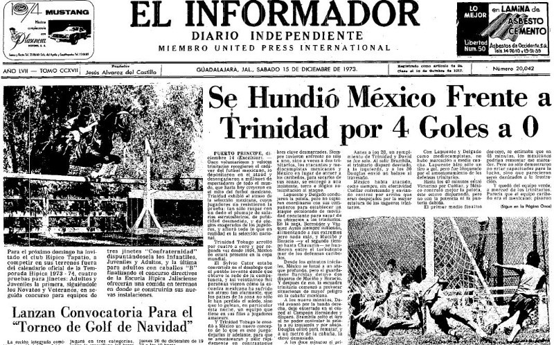 No dejó de ser una Copa del Mundo, pero el hecho de que México no asistiera al Mundial de Alemania en 1974 influyó para que el interés del certamen no fuera el mismo de otras ediciones.El Tricolor había hecho el ridículo en diciembre de 1973 en Haití, donde no logró el boleto al evento que se llevó a cabo en la que para entonces se llamaba Alemania Federal. Sin el equipo nacional en suelo germano, el Mundial no siempre fue la nota principal de deportes en EL INFORMADOR, habida cuenta de que los Charros de Jalisco estaban en plena campaña de la Liga Mexicana de Beisbol, y los equipos tapatíos jugaban partidos amistosos ante clubes internacionales.En su portada del jueves 13 de junio, EL INFORMADOR considera que Brasil va por su cuarto título, debido a que es el campeón vigente. La misma nota da cuenta de que Alemania Federal es el favorito por Europa, para nombrar después a Italia, Yugoslavia, y hasta la cuarta posición aparece Holanda.La edición de 1974 fue también la única posibilidad de ver en la misma Copa del Mundo a las dos Alemanias, la Federal y la Democrática, que además integraron el Grupo A y se enfrentaron en Hamburgo en el tercer duelo de ese sector. Fue además la primera gran sorpresa del evento, pues la RDA ganó 1-0 y relegó al segundo lugar del grupo a la RFA. La portada deportiva de este diario da cuenta de que el partido se había jugado bajo estrictas medidas de seguridad, por la amenaza de bomba en el estadio por parte de grupos terroristas.Para entonces la primera página deportiva de este medio incluía al menos un par de fotos, en este caso ambas del Mundial y que aún se firmaban como Radiofoto de la UPI exclusiva para EL INFORMADOR.Alemania 74 tuvo también la novedad de que tras la ronda de grupos no se jugaron Cuartos de Final, pues se formaron dos grupos con los clasificados de cada sector que se enfrentaron todos contra todos. El ganador de cada grupo clasificó a la Final y el segundo lugar al duelo por el tercer puesto.En el Grupo A quedaron Holanda, Brasil, Alemania Democrática y Argentina, mientras que en el B, Alemania Federal se benefició de la derrota ante la otra Alemania, pues quedó enclavado con Polonia, Suecia y Yugoslavia.El 8 de julio EL INFORMADOR titula Alemania Occidental conquistó la corona, y en la crónica da cuenta de que, pese a ser el anfitrión, el resultado fue una gran sorpresa, pues los holandeses eran los favoritos.Pese a la ausencia del Tri, el futbol de la Naranja Mecánica terminó por atraer hacia el Mundial a los aficionados locales.Luego de asistir a todos los Mundiales tras la Segunda Guerra Mundial, México se topó de frente con una amarga realidad: no era el gigante que todo mundo en Concacaf suponía.Haití y Trinidad y Tobago, dos escuadras que en aquel entonces no existían en el mapa futbolístico, eliminaron al Tri del Mundial de Alemania 1974.El Premundial se jugó en Haití y sólo había un boleto para el área. México empezó mal y terminó mal. Empató con Guatemala y Honduras, goleó 8-0 a Antillas Holandesas y perdió 4-0 con Trinidad y Tobago para que, tras la victoria 1-0 sobre el local, la suerte estuviera echada. Terminó tercero del clasificatorio y escribió su primer gran página negra en las Eliminatorias.