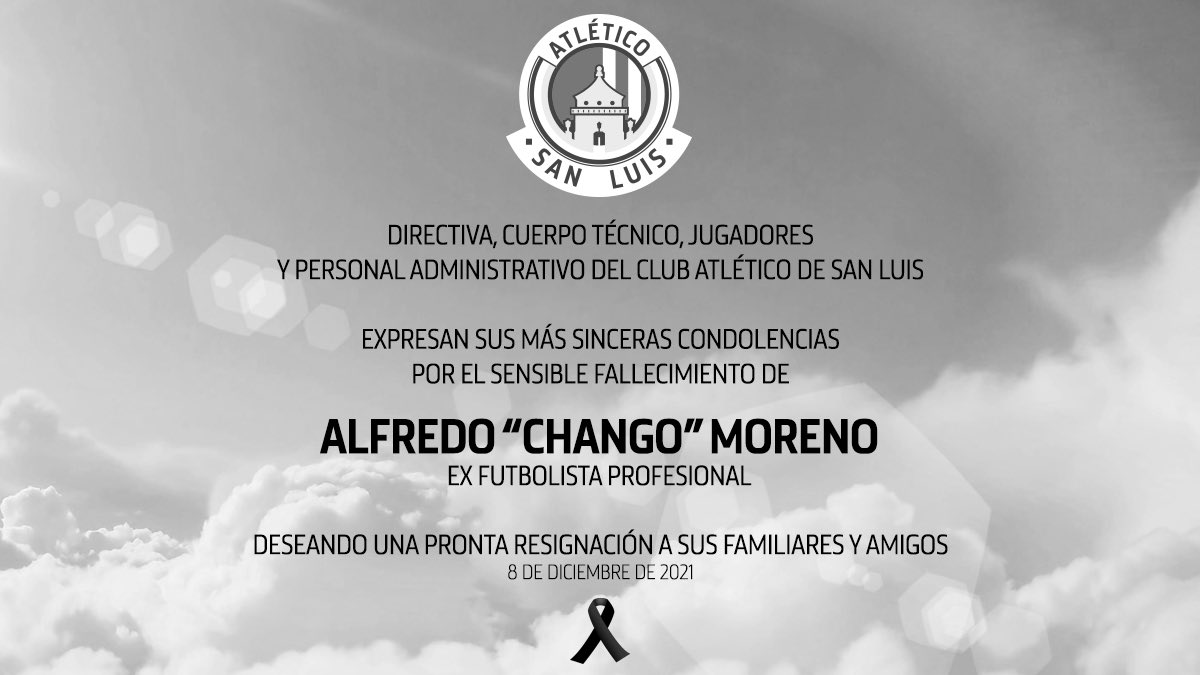 Mediante un comunicado a través de sus redes sociales, el club Atlético San Luis confirmó la lamentable noticia de que Alfredo "Chango" Moreno, uno de sus históricos futbolistas, falleció a los 41 años. En los días previos, varios clubes de la Liga MX en los que militó el delantero argentino habían compartido que el "Chango" se encontraba internado, luchando contra una enfermedad grave y solicitaron apoyo con donadores de sangre y de plaquetas.Algunas fuentes cercanas al futbolista e incluso algunos medios de comunicación, confirman que Alfredo Moreno estuvo hospitalizado en Aguascalientes, a causa de un cáncer en el páncreas. Durante su carrera como futbolista, Alfredo Moreno se convirtió en uno de los delanteros más cotizados del futbol mexicano. El "Chango", como era conocido, vistió las playeras de Necaxa, San Luis, América, Atlas, Tijuana, Puebla, Veracruz y el Celaya. Con los potosinos vivió sus mejores épocas pues se convirtió en campeón de goleo en el Apertura 2007. Otra de sus grandes etapas la vivió con los Xolos de Tijuana, pues bajo el mando de Antonio Mohamed, se coronó en el Apertura 2012 como campeón de la Liga MX. Además, Alfredo Moreno tiene de momento una distinción única en el futbol mexicano y es que gracias a sus 146 anotaciones se convirtió en el futbolista argentino con más goles en la historia de la Primera División de México.JL