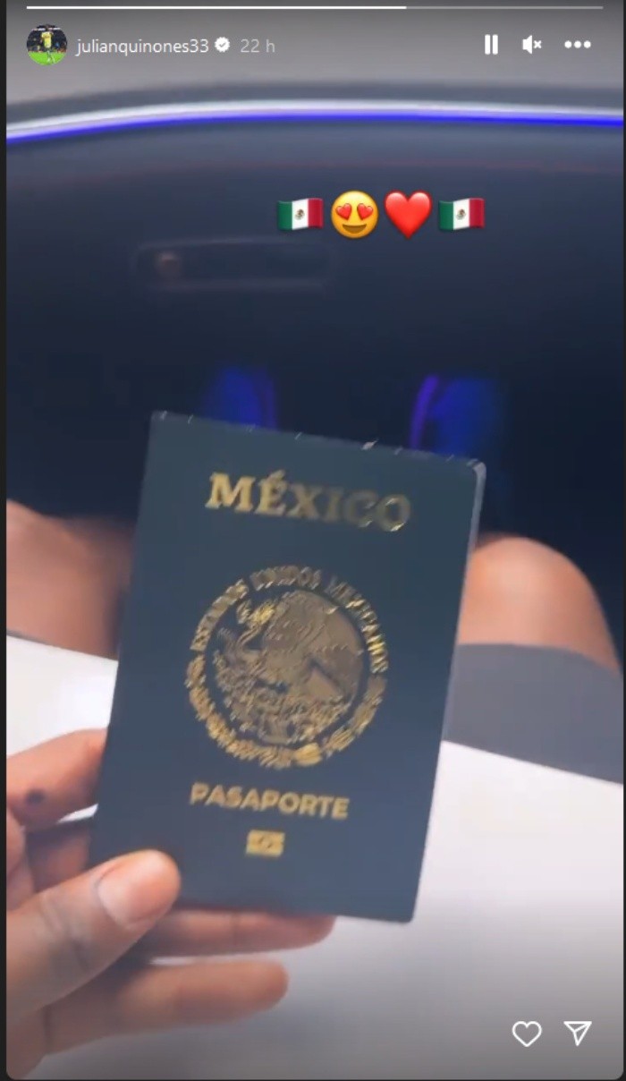 En los siguientes días, la Selección Mexicana disputará un par de partidos amistosos contra Ghana y Alemania con una gran ausencia: Julián Quiñones. Sin embargo, el delantero del América ya presumió su nuevo pasaporte mexicano, uno de los últimos pasos que le hacían falta para poder vestir la camiseta del Tri próximamente.En el vuelo que lleva a los jugadores del América a Estados Unidos para disputar el clásico nacional contra Chivas este domingo, el goleador azulcrema mostró ante las cámaras su pasaporte mexicano.Hace unos días, Quiñones recibió su carta de naturalización; sin embargo, le hacía falta este documento para poder enviar sus papeles a la FIFA y solicitar el cambio de Federación de Colombia a México.Ahora, si bien Quiñones no será tomado en cuenta para los partidos contra Ghana y Alemania, Jaime Lozano reconoció que será tomado en cuenta para la Concacaf Nations League que se llevará a cabo en noviembre.Este torneo, cobra importancia por otorgar un boleto a la próxima edición de la Copa América, por lo que en caso de asistir, el delantero de las Águilas tendrá que demostrar que merece un lugar en la Selección.vll