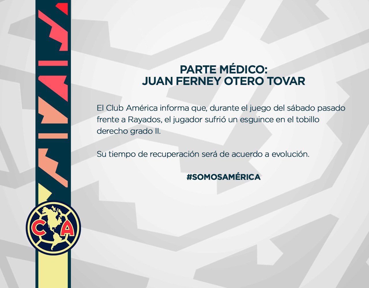 América sigue sin encontrar fortuna en este Clausura 2022, pues este martes el cuadro azulcrema anunció que Juan Otero está lesionado.“El Club América informa que, durante el juego del sábado pasado frente a Rayados, el jugador sufrió un esguince en el tobillo derecho grado II. Su tiempo de recuperación será de acuerdo a evolución”, explicaron las Águilas en un comunicado.Otero comenzó este 2022 jugando con Santos Laguna, pero después fue fichado por el cuadro de Coapa y ya ahí ha disputado seis partidos en donde sólo ha aparecido como titular en dos oportunidades.El próximo compromiso del América será este sábado 2 de abril, fecha en que visitarán a los Rayos del Necaxa.JL