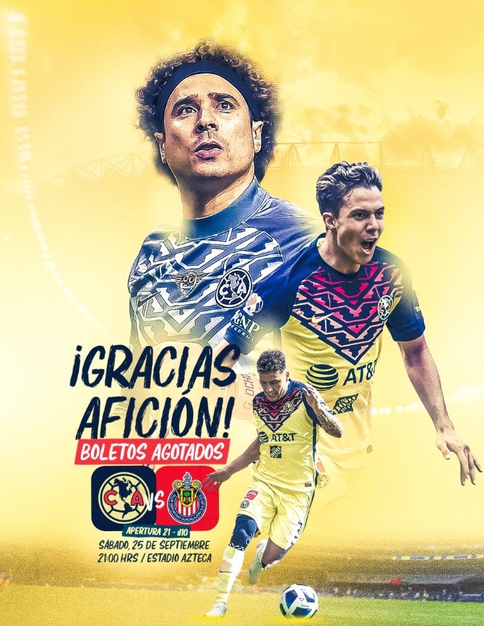 A través de sus redes sociales, el Club América anunció que los boletos para el Clásico Nacional ante Chivas de este sábado 25 de septiembre se han agotado, por lo que se espera la mejor entrada a un partido desde que comenzara la pandemia del Coronavirus. Las Águilas recalcaron y agradecieron el apoyo de los aficionados para que el boletaje se agotara y el partido en el Coloso de Santa Úrsula se perfila para ser una auténtica fiesta.Gracias a que el semáforo epidemiológico se encuentra en amarillo en la Ciudad de México, el aforo permitido para el Clásico entre América y Chivas en el mítico Estadio Azteca será del 75% equivalente a poco más de 60 mil aficionados. Será la primera ocasión desde que inició la pandemia en la que la Liga MX tendrá un partido con ese nivel de aforo permitido y se registrará el mayor ingreso de aficionados a un inmueble del futbol mexicano desde entonces. Cabe mencionar que para ingresar al Coloso de Santa Úrsula el día del partido, se debe cumplir con las indicaciones del personal de salud, así como respetar los filtros sanitarios y hacer el uso correcto del cubrebocas en todo momento, respetando la sana distancia.Fecha: Sábado 25 de septiembreHorario: 21:00 hrsLugar: Estadio AztecaTransmisión: Canal 5, TUDN, AfizzionadosSi quieres tener más contenido, más imágenes y aún más noticias, entonces descarga INFORMAPlus, la aplicación digital de EL INFORMADOR, donde tenemos materiales exclusivos para tí.Descarga la aplicación y pruébala GRATIS por treinta días. Para iOS: https://apple.co/35jaVgbPara Android: https://bit.ly/3gwVSEVSi eres suscriptor de EL INFORMADOR tu acceso está incluido, solicítalo al 33 3678-7777JL