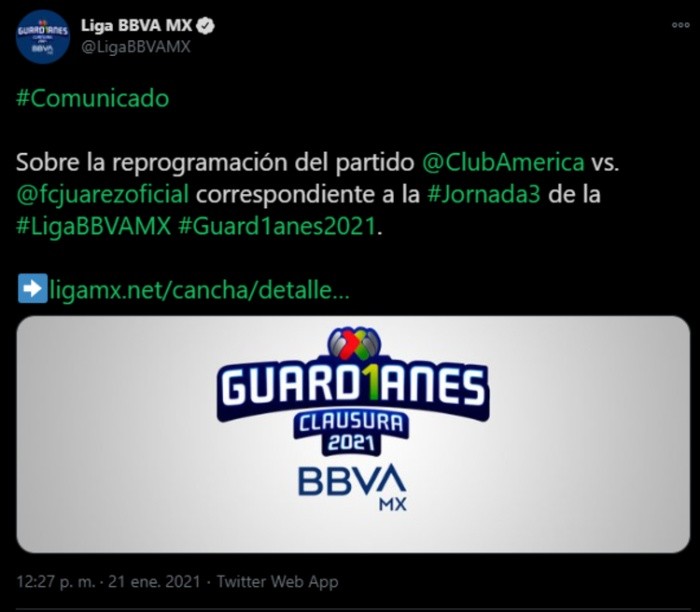 Este jueves, la Liga MX informó que como medida preventiva por la salud de los jugadores de las Águilas del América, así como de Bravos de Juárez (próximo rival), se determinó reprogramar el partido de la Jornada 3 del Torneo Guard1anes 2021.Este juego estaba programado para el sábado 23 de enero, sin embargo, cambia de fecha al miércoles 3 de febrero.''La LIGA BBVA MX reitera su compromiso con el Juego Limpio y con el puntual cumplimiento de los protocolos establecidos, así como con el cuidado de la integridad de jugadores, cuerpo técnico y staff en cada una de las instituciones que componen la Liga'', indican en un comunicado.Miércoles 3 de febrero, 2021 21:00 horas Estadio Azteca OF