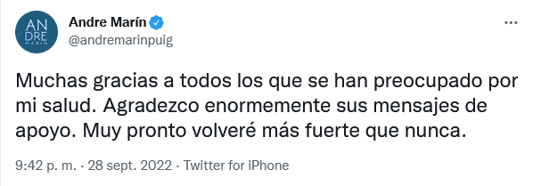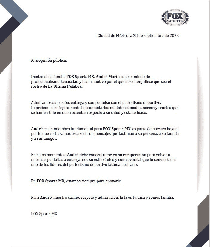 André Marín ha acaparado las tendencias en redes sociales los últimos días debido a su estado de salud y ayer, después de la última emisión del programa "La Última Palabra" no fue la excepción.El polémico comentarista deportivo salió de FOX Sports para enfocarse en su salud, ya que desde hace años enfrenta un problema que le está causando diversas afectaciones físicas, las cuales han abierto la conversación entre los espectadores del programa que encabezaba.Fue poco antes de que iniciara la pandemia de COVID-19 que André Marín reveló que contrajo una fuerte infección en el estómago ocasionada por una bacteria, la cual le ha hecho perder peso.Los últimos días, en redes sociales han abundado mensajes de apoyo para el conductor, sin embargo, también han circulado mensajes críticos, ante los que la televisora emitió un comunicado en el que se dio a conocer que dejará su trabajo en pantalla de manera temporal."En estos momentos, André debe concentrarse en su recuperación para volver a nuestras pantallas a entregarnos su estilo único y controversial que lo convierte en uno de los líderes del periodismo deportivo latinoamericano. En FOX Sports MX, estamos siempre para apoyarle", dice el texto.Por su parte, André Marín respondió en sus redes sociales:"Muchas gracias a todos los que se han preocupado por mi salud. Agradezco enormemente sus mensajes de apoyo. Muy pronto volveré más fuerte que nunca".En el último programa de "La Última Palabra", André Marín ya no estuvo presente.OF
