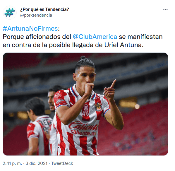 En redes sociales circula el hashtag viral #AntunaNoFirmes, con el que los aficionados del América piden que el atacante de Chivas no llegue a las Águilas como refuerzo para el Torneo Clausura 2022.Se ha rumorado los últimos días que Uriel Antuna podría emigrar del Rebaño a Coapa en un intercambio por Sebastián Córdova, mientras que los seguidores del equipo emplumado piden de diferentes maneras que eso no suceda.Uriel Antuna llegó a Chivas para el Torneo Clausura 2020, procedente de Los Angeles Galaxy, con la idea de ayudar a que el equipo retomara el camino del éxito inmediato, a la par de consolidarse como uno de los mejores talentos del futbol mexicano.Aunque ha sido convocado por la Selección Mexicana y logró la medalla de bronce con el representativo Sub-23 en los juegos Olímpicos de Tokio 2020, en cuatro torneos, el mediocampista no ha explotado como se esperaba. Ha participado en 62 partidos en la Liga MX, y ha anotado seis goles, dos de ellos en la Fase final del pasado Guard1anes 2020.OF
