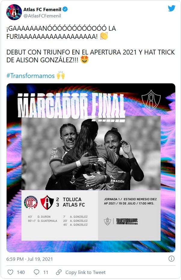 Y sigue en plan grande. La delantera Alison González continúa siendo la referente, no sólo de las rojinegras, sino del futbol tapatío y mexicano, y es que ella sola le dio al Atlas Femenil el triunfo sobre Toluca 3-2 en el debut en el Apertura 2021 en la Liga MX Femenil, esto tras anotar un “hat trick” en su visita al Estadio Nemesio Díez.La gran tarde de la nacida en Tepic, Nayarit comenzó al minuto 7, siguió al 20’ y culminó al 46’, para darle forma a lo que sería la primera victoria de las rojinegras en el certamen; sin embargo, las Diablas de Toluca intentaron reaccionar por conducto de Destinney Durón al minuto 43 y Diana Guatemala ya en tiempo de compensación al 91’; no obstante, esto no fue suficiente y los tres puntos fueron para las dirigidas por Fernando Samayoa.El siguiente compromiso de las rojinegras será el próximo sábado 24 de julio, cuando reciban a Querétaro en partido que se tiene programado que sea en las canchas de CECAF al filo del mediodía.JM