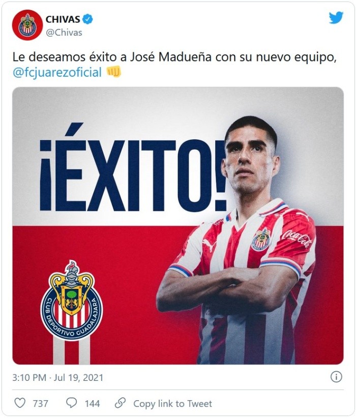 A falta de sólo cinco días para que Chivas haga su debut oficial en el Apertura 2021, la directiva del equipo confirmó nuevamente que no habrá refuerzos de cara a este torneo, y además se hizo oficial la baja del defensor José Madueña, quien pasará a jugar con el conjunto de los Bravos de Juárez.Después del entrenamiento que realizó el Rebaño Sagrado este lunes en el municipio de Ameca, el director deportivo del Guadalajara, Ricardo Peláez, afirmó de manera implícita que el equipo ya cerró filas de cara al Apertura 2021 y no habrá refuerzos.“Lo planeamos así. Después de la pretemporada en Barra de Navidad y la gira por Estados Unidos, estamos preparados y listos para iniciar con el pie derecho. Hay un gran ambiente, buena comunicación, alegría, ilusión, compromiso, responsabilidad y consciencia de la necesidad que tenemos y lo que quiere la gente, ojalá podamos dárselo”.Asimismo, la tarde de este lunes el equipo del Guadalajara confirmó un secreto a voces a través de sus redes sociales, pues hizo oficial la baja de José Madueña rumbo al arranque del siguiente certamen.Madueña fue uno de los ocho flamantes refuerzos que llegaron a Chivas en 2020, en el inicio de la era Peláez con el Guadalajara, sin embargo en los últimos años ha sido uno de los jugadores menos productivos del Rebaño Sagrado al haber jugado sólo siete partidos de Liga MX en año y medio.Ahora Madueña buscará probar suerte en la frontera con los Bravos de Juárez, bajo el mando de un entrenador estricto como lo es Ricardo Ferretti.JM