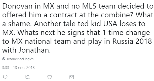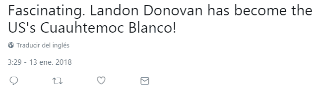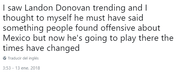 El club León de la Liga MX anunció anoche la contratación del jugador estadounidense Landon Donovan. La llegada del "Capitán América" a un país con el que hasta hace poco tenía una fuerte rivalidad causó en los usuarios de redes sociales en Estados Unidos tanto escepticismo, entusiasmo y risas como en México, demostrando que tal vez los dos países no son tan diferentes después de todo.Al norte de la frontera la reacción inicial a la noticia también fue de incredulidad."¿Por qué veo noticias diciendo que Landon Donovan sale del retiro?, ¿es esto la vida real?", se preguntaba un aficionado en Twitter, mientas otro reflexionaba:"Vi que Landon Donovan era un 'trending topic' y pensé que seguramente dijo algo ofensivo sobre México, pero ahora va a jugar allá. Los tiempos han cambiado".Una vez confirmado el traspaso, la ironía no tardó mucho en aparecer. "Landon Donovan me aparece como 'Trending Topic', ¿Qué año es?", publicó un aficionado. Otro usuario fingía indignación."¿Donovan en México y ningún equipo de la MLS le ofreció un contrato? Qué vergüenza. Otra promesa que Estados Unidos pierde ante México. ¿Qué sigue, que firme el cambio a la Selección mexicana y juegue Rusia 2018 con Jonathan González?".Para una seguidora, el nuevo apodo futbolero de Donovan debería ser "Landon 'voy-a-mantenerme-relevante-aunque-me-mate' Donovan".También llegaron las comparaciones. Un seguidor observaba que, "Landon Donovan es el Brett Favre del futbol soccer", haciendo referencia al inoxidable mariscal de campo, mientras otro usuario veía la semejanza entre el caso de Donovan y el de Cuauhtémoc Blanco, que jugó en la MLS para el Chicago Fire. "Fascinante. ¡Landon Donovan se ha convertido en el Cuauhtémoc Blanco de Estados Unidos!".Además de la incredulidad y la ironía, también hubo espacio para el entusiasmo. Un seguidor del "Capitán América" celebró publicando, "¡Landon Donovan está de regreso, baby! Qué dia tan glorioso", al tiempo que otros se emocionaban tanto por la noticia que se planteaban dudas como, "sé que soy seguidor de Chivas, ¿pero está mal querer un jersey de Landon Donovan con León?".Ya entrados en gastos, un amante del futbol hizo una petición a los Panzas Verdes: "Todo lo que quiero es ver un día a Pulisic (jugador estadounidense del Borussia Dortmund) y Donovan con el mismo uniforme. Te toca, León".