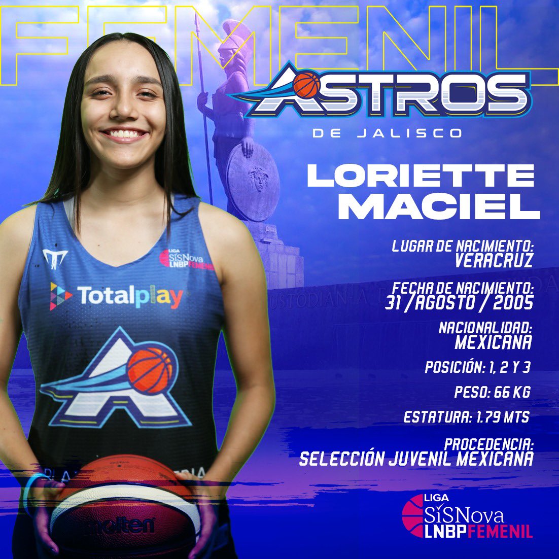 Entusiasta, veloz y dinámica, la seleccionada nacional Loriette Maciel Arrieta fue anunciada oficialmente como nueva jugadora de Astros de Jalisco Femenil.La oriunda de Orizaba, Veracruz, ha destacado ya a nivel internacional representando a la Selección Mexicana en categorías juveniles y ahora tendrá la oportunidad de jugar a nivel profesional defendiendo los colores de Astros.“El basquetbol siempre ha sido parte de mi vida desde muy pequeña. Nunca me había imaginado a esta edad participar en un equipo profesional, la verdad es muy importante para mí. Es una gran oportunidad para mi desempeño en el basquetbol”, comentó en su presentación.En agosto del año pasado, Loriette destacó en el Campeonato FIBA Americas U16, donde mostró un gran nivel con la selección mexicana femenil, siendo una de las cinco elegidas en el cuadro ideal del torneo.Además de estar entre las cinco mejores del FIBA Americas U16, Loriette lideró a la escuadra mexicana con un promedio de 12.3 puntos y 5.2 rebotes por partido, siendo pieza fundamental para que por primera vez en la historia México ganara la medalla de bronce y conquistara así su pase al Mundial de Hungría 2022.Ahora la joven jugadora buscará demostrar su talento portando los colores de Astros en la primera temporada de la Liga Nacional de Baloncesto Profesional Femenil.La quinteta tapatía debutará el 6 de mayo visitando a Abejas de León, y jugarán en la Arena Astros hasta el 10 de mayo cuando reciban a Panteras de Aguascalientes.JL