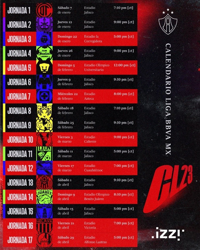 Este miércoles, la Liga MX dio a conocer de manera oficial el calendario de partidos para el Torneo Clausura 2023 y para los Rojinegros del Atlas se viene un semestre lleno de actividad, ya que entre Liga y Concachampions, se verán cargados de partidos a partir del próximo mes de marzo.Ante esto, el próximo sábado 7 de enero, los Zorros de Benjamín Mora debutarán en el Estadio Jalisco ante los Diablos Rojos del Toluca a las 19:10 horas. Unos días después, repetirán actividad también en casa ante Mazatlán el jueves 12 de enero a las 21:00 horas.Los Zorros tendrán nueve partidos como local, los ya mencionados ante los Diablos y los Cañoneros de Mazatlán, así como ante Santos, Rayados, Tigres, América, León y Pachuca. Además de que se disputará el Clásico Tapatío en la casa de los rojinegros el 1 de abril.JL