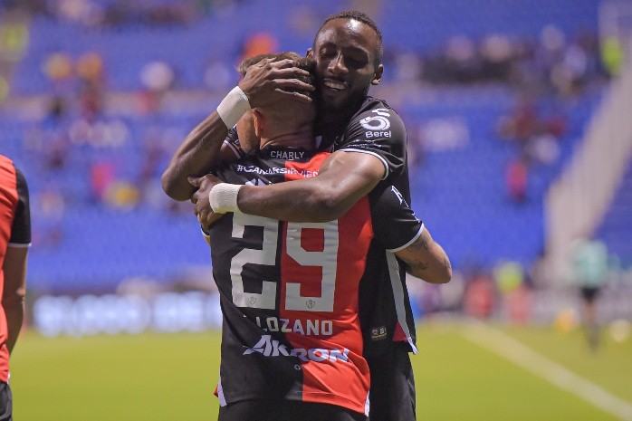 Brian Lozano y Julián Quiñones en festejo de gol en la victoria de 4-0 sobre el Puebla. IMAGO 7