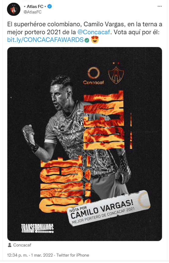 El portero colombiano del Atlas, Camilo Vargas, ha sido nominado para formar parte del once ideal de los Concacaf Awards, esto gracias a sus actuaciones bajo los tres postes de la portería del equipo campeón del futbol mexicano. El portero de los rojinegros comparte la terna de nominados con Keylor Navas, actual portero del PSG, Matt Turner, cancerbero del combinado de las barras y las estrellas, y Andrew Blake, guardameta titular de la Selección de Jamaica."Camilo Vargas destacó con Atlas FC para que los Rojinegros rompieran su sequía de títulos en décadas y se ganaran un puesto en la Scotiabank Concacaf Champions League 2023. Fue el portero de la Liga MX con más arcos en cero (12), lo cual le ayudó a ganarse un lugar en la selección colombiana para la Copa América 2021", señaló la página oficial de la Concacaf.Hasta ahora en el Clausura 2022, el arquero rojinegro acumula tres partidos dejando su arco en cero, sumando un total de 15 porterías invictas a lo largo de todo el año calendario, contando Liguilla, logrando el mejor registro de un guardameta en la Liga MX durante ese lapso de tiempo. OF