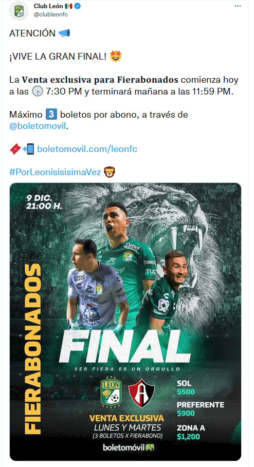 Hoy jueves 9 de diciembre inicia la serie por el título de la Liga MX. El duelo León vs Atlas se disputará en punto de las 21:00 horas en el Estadio Nou Camp, y muchos aficionados de los tapatíos ya se encuentran planeando su viaje para apoyar al equipo hasta la capital de Guanajuato, debido a su cercanía con la ciudad de Guadalajara.León es uno de los mejores sitios turísticos del país. La ciudad es reconocida, además del equipo esmeralda, por el popular Festival del Globo, la Fuente de los Leones, el Templo Expiatorio, y el Centro de la Ciudad.Regresando al futbol, los Rojinegros del Atlas, que regresaron a una final después 22 años, visitarán este jueves al León en el inicio de la serie que decidirá el campeón del Torneo Apertura 2021 del futbol mexicano.León fue campeón el año pasado, tras derrotar a Pumas en el Torneo Guard1anes 2020.Contra predicciones, la serie no tiene un claro favorito porque ambos equipos llegan en igualdad de condiciones.Los técnicos argentinos Diego Cocca y Ariel Holan han tomado carta de las fallas y ahora pretenden que sus equipos muestren su mejor futbol en una final rodeada de expectativas porque cualquiera de los dos tiene con qué para ganar.La venta de boletos para el partido de ida en León comenzó la noche del lunes, y como ha sido a lo largo de toda la temporada, se realiza solo vía electrónica, ya sea en la página o en la aplicación Boletos Móvil.Los abonados podrán comprar hasta tres boletos, y será a partir del miércoles que se ven entradas para el público general.OF