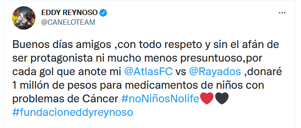 El líder del "Canelo Team", Eddy Reynoso, se puso generoso y en su cuenta de Twitter informó que por cada gol que anoten los rojinegros en el partido Atlas vs Monterrey, él donará un millón de pesos para la compra de medicamentos a menores con cáncer."Buenos días amigos, con todo respeto y sin el afán de ser protagonista ni mucho menos presuntuoso, por cada gol que anote mi @AtlasFC vs @Rayados, donaré 1 millón de pesos para medicamentos de niños con problemas de Cáncer #noNiñosNolife#fundacioneddyreynoso", dice el mensaje en la red social.Reynoso es seguidor de Atlas, e incluso previo al partido de ida de los Cuartos de Final, manifestó el apoyo a su equipo.No es la primera vez que un miembro del "Canelo Team" realiza una labor altruista, de hecho, Saúl "Canelo" Álvarez recientemente también hizo una donación por un millón de pesos a la asociación Nariz Roja, quien se encarga de atender a niños con cáncer.Atlas se enfrenta este sábado a Rayados en busca del pase a las semifinales del Apertura 2021, el marcador global es 0-0 y un empate les favorece a los Zorros.OF