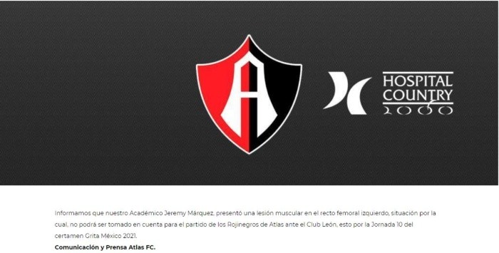 Los Zorros del Atlas no contarán con Jeremy Márquez para el duelo de esta tarde ante León.Fue este sábado cuando el equipo rojinegro anunció la baja de su jugador por una lesión muscular.“Informamos que nuestro Académico Jeremy Márquez, presentó una lesión muscular en el recto femoral izquierdo, situación por la cual, no podrá ser tomado en cuenta para el partido de los Rojinegros de Atlas ante el Club León, esto por la Jornada 10 del certamen Grita México 2021”, detalló el club rojinegro.Aunque no se especificó el tiempo de recuperación para Jeremy, existe la posibilidad de que esta lesión también lo aleje del Clásico Tapatío ante Chivas, mismo que se jugará la próxima semana. Si quieres tener más contenido, más imágenes y aún más noticias, entonces descarga INFORMAPlus, la aplicación digital de EL INFORMADOR, donde tenemos materiales exclusivos para tí.Descarga la aplicación y pruébala GRATIS por treinta días. Para iOS: https://apple.co/35jaVgbPara Android: https://bit.ly/3gwVSEVSi eres suscriptor de EL INFORMADOR tu acceso está incluido, solicítalo al 33 3678-7777JL