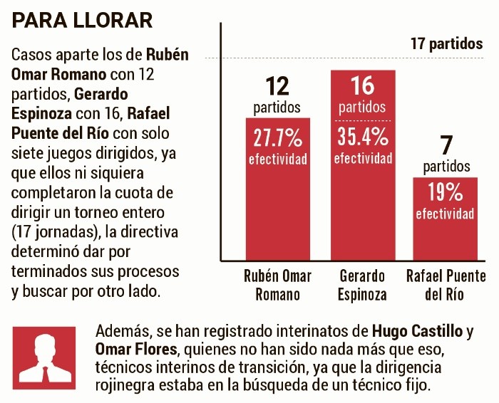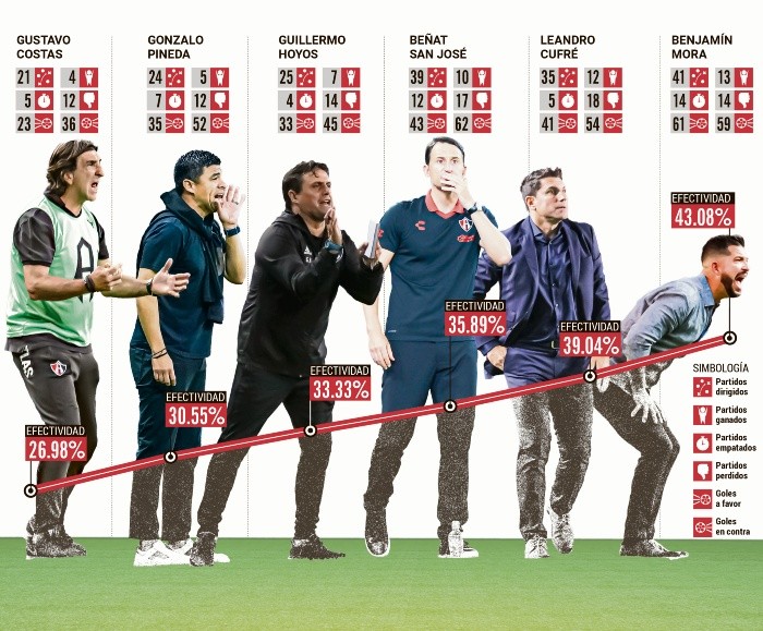La reciente renuncia de Gonzalo Pineda como técnico del Atlas, tras un gris paso de apenas cinco victorias en 24 partidos y una efectividad del 30.55%, no solo evidencia la crisis actual del club, también reabre el debate sobre la serie de apuestas fallidas que han pasado por el banquillo rojinegro en los últimos años en los que el club ha pasado por las manos de dos dueños distintos, es decir desde la compra de Grupo Salinas en 2013 y la llegada de Grupo Orlegi en 2019.Pineda se marcha dejando 52 goles en contra, un registro que lo coloca entre los estrategas con peores números en la era moderna del Atlas. Sin embargo, no es el único que dejó más dudas que certezas.En la lista de técnicos con más de 20 partidos dirigidos y resultados decepcionantes figura el argentino Gustavo Costas, el de peor efectividad (26.98%). Su etapa, con apenas cuatro victorias en 21 juegos, fue marcada por un futbol plano y defensas frágiles que encajaron 36 goles; un técnico más preocupado por reclamar, correr en su área técnica y sonreír ante la adversidad.Le sigue Guillermo Hoyos, quien en 25 partidos apenas sumó siete triunfos, cuatro empates y 14 derrotas, con 45 goles en contra. Su efectividad de 33.33% y un estilo de juego inconsistente terminaron por condenarlo.El español Beñat San José, el antecedente inmediato al proceso de Pineda, tampoco logró cuajar: en 39 encuentros ganó solo 10, perdió 17 y recibió 62 goles, con una efectividad de 35.89%. Su Atlas se caracterizó por desplomarse en la segunda mitad de los torneos.Otro caso es el de Leandro Cufré, de los primeros técnicos que trabajaron bajo el techo de Grupo Orlegi y quien llegó con promesas de estabilidad, pero firmó 12 victorias en 35 duelos, acumulando 18 derrotas y una efectividad de 39.04 por ciento.Benjamín Mora, aunque con mejor porcentaje (43.08%), tampoco logró trascender: en 41 partidos tuvo marca pareja de victorias y derrotas (13 y 14, respectivamente) y una defensa que permitió 59 tantos. Eso sí, de los técnicos ya citados, fue el único que dirigió en una liguilla.Entre interinatos y apuestas fallidas, Atlas ha vivido más de una década de inestabilidad en el banquillo. La historia reciente deja claro que no basta con cambiar de técnico: la dirigencia rojinegra enfrenta el reto de romper con la dinámica de procesos cortos, malas defensas y efectividades que difícilmente superan el 40 por ciento.En la memoria de La Fiel quedan promesas incumplidas y un anhelo constante: encontrar a un estratega que transforme las estadísticas para que Atlas deje de engrosar la lista negra de técnicos que, como Pineda, salieron por la puerta de atrás.