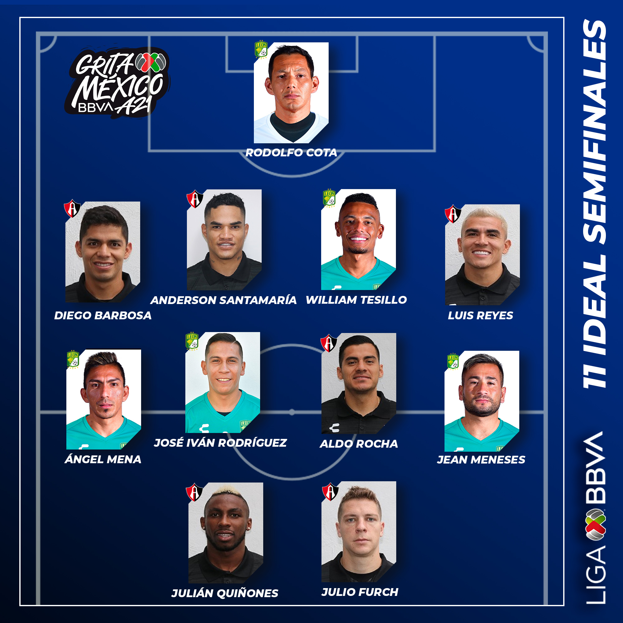 Tras dos partidos vibrantes, Atlas y León consiguieron su boleto a la Gran Final del Apertura 2021 y lo hicieron de manera similar. Ambos conjuntos empataron el marcador global y accedieron al duelo decisivo por mejor posición en la tabla.Con esto como aval, la Liga MX dio a conocer el once ideal de las Semifinales y el conjunto Rojinegro asume el protagonismo con 6 elementos además del director técnico. León por su parte, cuenta con 5 elementos que completan la alineación.La oncena está conformada por Rodolfo Cota quien ocupa la portería. Quizá el error en el gol ante Pumas, le cuesta la ausencia a Camilo Vargas. En la defensa, tres zorros se hacen presentes. Diego Barbosa, Anderson Santamaría y Luis Reyes se ganaron su lugar tras la solidez mostrada ante los Pumas. William Tesillo de León, completa la defensa tras su gran actuación ante Tigres. Para el mediocampo, la situación se invierte, Tres elementos de León dominan la mitad de la cancha y solo uno de Atlas se hace presente. José Iván Rodríguez de los Esmeraldas, hace pareja en el centro con Aldo Rocha, capitán rojinegro. Por las bandas, dos jugadores de la "Fiera" que marcaron los goles durante la eliminatoria ante Tigres, Ángel Mena y Jean Meneses.En el ataque, a León le pesa no tener un centrodelantero fijo y ante este motivo, aunado a la gran serie que hicieron, Julián Quiñones y Julio César Furch lideran el ataque del once ideal de las Semifinales del Apertura 2021.Finalmente, la Liga MX también dio a conocer al entrenador ideal y no podría ser otro. Diego Cocca mete a los Rojinegros a una Final tras 22 años y disputarán el máximo título del futbol mexicano, el que aspiran a ganar 70 años después. JL