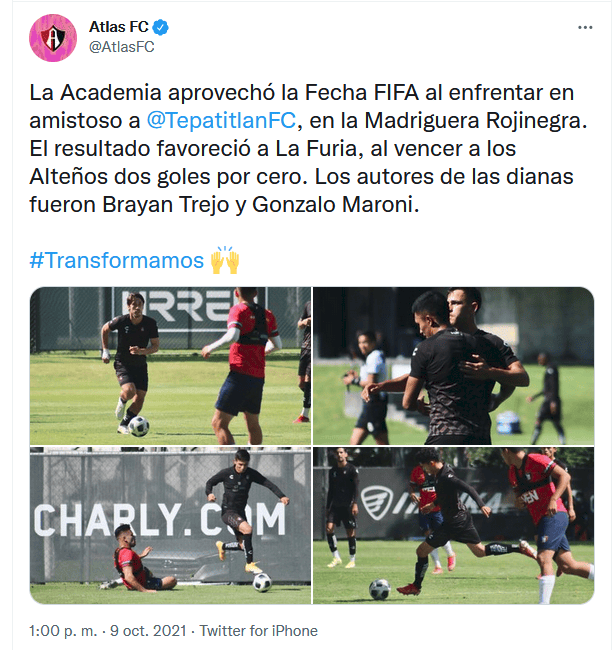 Los Zorros del Atlas aprovecharon esta Fecha FIFA y se enfrentaron al Tepatitlán de la Liga de Expansión para no perder el ritmo de juego que han mostrado en el Torneo Apertura 2021.En este duelo ante los Alteños, mismo que se llevó a cabo en territorio rojinegro, los dirigidos por Diego Cocca lograron imponerse con marcador final del 2-0.Según lo informó Atlas, Brayan Trejo y Gonzalo Maroni fueron los autores de los tantos rojinegros, y de esta forma, a pesar de ser un duelo amistoso, el delantero argentino marcó su primera diana con la camiseta del Atlas.Luego de imponerse al Tepatitlán en este duelo y a las Chivas en su último juego oficial, el Atlas volverá a la actividad de la Liga MX el próximo 15 de octubre, día en que la academia visitará al Mazatlán en punto de las 21:00 horas.De momento, a falta de que se reanude el torneo, los Zorros marchan con buen ritmo en el certamen, ya que son sublíderes de la clasificación al ubicarse solo por debajo de las Águilas del América.Entre estos dos equipos la diferencia de puntos solo es de tres unidades, pues mientras que Atlas ostenta 22, las Águilas cuentan con 25.OF