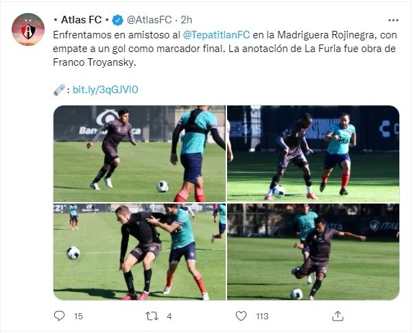 El campeón del futbol mexicano realizó este día su primer ensayo con miras al próximo Clausura 2022, pues este viernes los Zorros del Atlas se enfrentaron a los Alteños de Tepatitlán para llevar a cabo su primer juego de pretemporada.Fue dentro de las instalaciones de la Madriguera Rojinegra que el Atlas se midió al cuadro de la Liga de Expansión, y el resultado final fue un empate a un gol en donde Franco Troyansky marcó el tanto por parte de los rojinegros.Por el bando alteño el gol corrió por cuenta Edson Rivera, quien precisamente es canterano de los Zorros.El Torneo Clausura 2022 comenzará el próximo 6 de enero, pero Atlas debutará en el certamen hasta el día 15 de ese mes, mismo en donde se verá las caras con el Atlético de San Luis en la cancha del Estadio Jalisco.JM