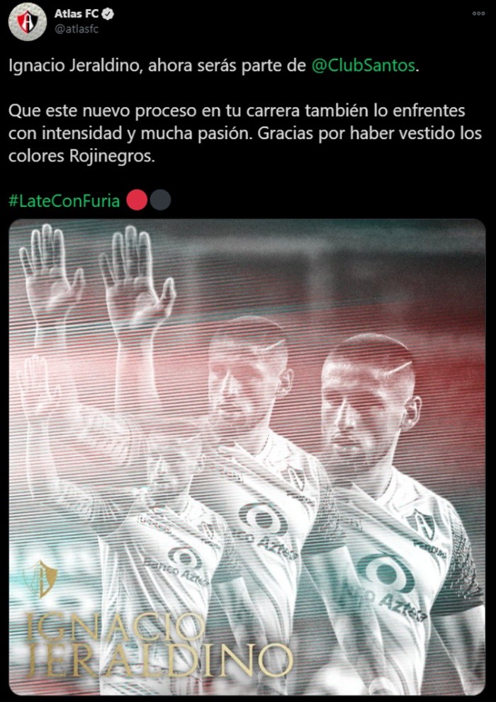 Grupo Orlegi movió sus fichas. Mientras que jugadores como Julio Furch y Brayan Garnica son anunciados como nuevos jugadores de Atlas procedentes de Santos Laguna, Ignacio Jeraldino deja La Madriguera y se incorpora a Santos Laguna, muy a pesar del deseo del propio jugador.El chileno fue un jugador con pocas oportunidades de mostrar las razones por las cuales la directiva decidió contratarlo, dejó mucho qué desear en la cancha y fuera de ella y de ahí que sólo haya marcado tres goles en 26 partidos y en más de mil 400 minutos en la cancha.La Fiel se queda con el recuerdo de Ignacio Jeraldino fallando claras opciones de gol, apatía en el campo y poca entrega hacia la playera de los rojinegros, en cambio, en Torreón se tiene la esperanza de que el andino despierte y logre lo que en su país pudo concretar, ser un goleador en equipos como Audax Italiano e incluso seleccionado nacional por su país.OF