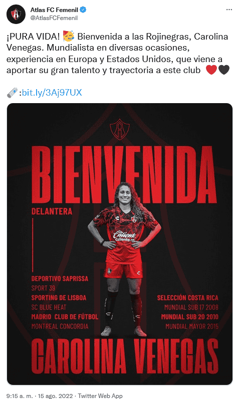 A casi medio torneo, las rojinegras del Atlas se siguen reforzando con la intención de cerrar de la mejor manera el Apertura 2022 de la Liga MX Femenil y para ello este lunes anunciaron la contratación de la delantera de Costa Rica, Carolina Venegas.La dorsal número "9" de la selección tica llega al plantel de las rojinegras para complementar y reforzar el ataque y hacer mancuerna con Norma Palafox, con la intención de sumar sus definiciones dentro del área y la gran experiencia que ha adquirido en las distintas Ligas Internacionales en las que ha tenido participación.La nueva delantera de la Academia ha militado para equipos como Deportivo Saprissa, Sport 39, Sporting de Lisboa, SC Blue Heat, Madrid FC y Montreal Concordia, así como en distintas categorías de la Selección de Costa Rica.OF