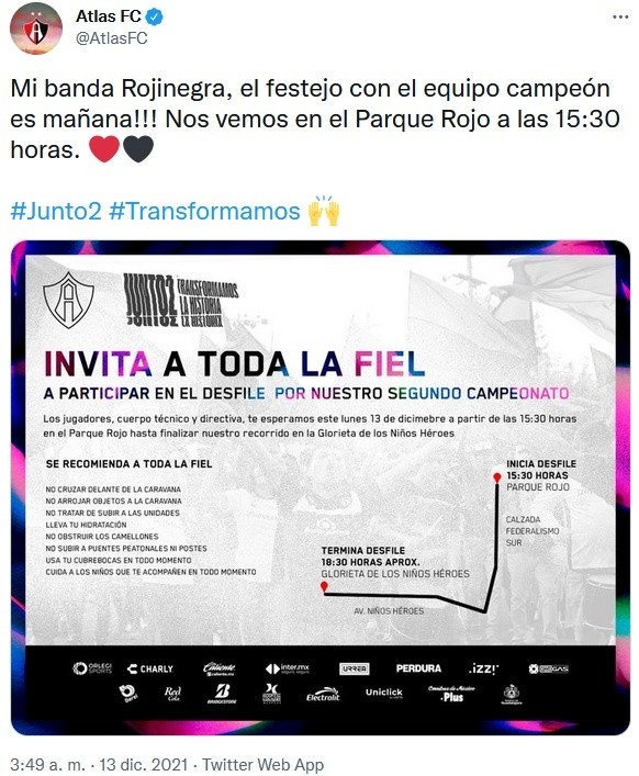 Luego de lograr su segundo campeonato ayer, el Atlas invitó a toda "La Fiel" a celebrar en un desfile por las calles de Guadalajara, para conmemorar el triunfo tras 70 años de sequía.A través de sus redes sociales, el Atlas informó que sus jugadores, cuerpo técnico y directiva participarán en un desfile por su segundo campeonato este lunes 13 de diciembre a partir de las 15:30 horas desde el Parque Revolución o "Rojo" hasta la Glorieta de los Niños Héroes.El recorrido irá por avenida Federalismo Sur, hasta avenida Niños Héroes para llegar a la también llamada Glorieta de los y las desaparecidas.Una vez concluido el desfile, los jugadores romperán filas y se irán unos días de vacaciones, para luego volver a iniciar su pretemporada, ya como campeones del futbol mexicano, en donde arrancarán el Clausura 2022 el sábado 15 de enero, cuando reciban en la Jornada 2 al Atlético San Luis en el Estadio Jalisco, toda vez que su partido de la Fecha 1 fue reprogramado.Ayer domingo Atlas venció 1-0 a León en los 90 minutos, igualó el global 3-3 y, con Camilo Vargas como héroe, conquistaron el ansiado título ganando 4-3 la tanda de penaltis.OA