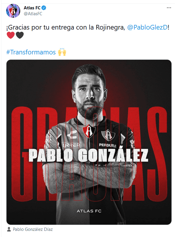 Mediante un escueto mensaje en redes sociales, los rojinegros del Atlas se despidieron este lunes del mediocampista Pablo González, señalando ''gracias por tu entrega con la Rojinegra''. El volante ex del Puebla pasará a las filas del Toluca.Pablo González llegó al Atlas como refuerzo para el Torneo Guard1anes 2021, en donde jugó ocho partidos, sólo dos de ellos como titular. En la ronda de Repechaje tuvo actividad frente a Puebla durante solo 30 minutos; sin embargo en este Apertura 2021 no ha visto un solo minuto en el terreno de juego.Es por eso que por reglamento pudo ser traspasado al Toluca, siendo uno de los jugadores más grises que han llegado al Atlas en los últimos años.¿Quieres saber más?Si quieres tener más contenido, más imágenes y aún más noticias, entonces descarga INFORMAPlus, la aplicación digital de EL INFORMADOR, donde tenemos materiales exclusivos para ti.Descarga la aplicación y pruébala GRATIS por treinta días.Si eres suscriptor de EL INFORMADOR tu acceso está incluido, solicítalo al 33 3678-7777OF