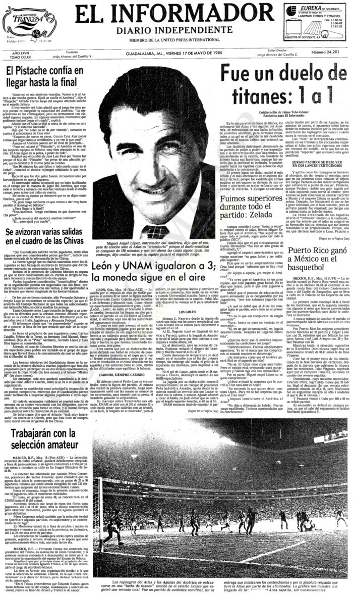 Este viernes se reanudan las acciones del futbol mexicano con la Jornada 4, y quizá el partido más importante sea el del próximo domingo 20 de agosto, cuando Atlas reciba al América en el Estadio Jalisco. A Guadalajara regresa Julián Quiñones, delantero que vivió las grandes glorias con Atlas apenas el año pasado, cuando el equipo se coronó bicampeón del balompié nacional, y, sin embargo, ahora intentará mostrar su espectacular manera de jugar, pero para la causa emplumada.Este reencuentro no es el único aspecto destacado del juego, pues los partidos entre Atlas y América han sido muy atractivos históricamente. Al menos así fue la serie de las semifinales de la temporada 1984-1985, cuando las Águilas dejaron fuera a los zorros en una emocionante tanda de penales."Nosotros no nos sentimos vencidos. Vamos a ir al Azteca a dar mucha guerra. Ojalá se confíe el América", dijo el técnico rojinegro Alfredo "Pistache" Torres, luego del empate obtenido en el Estadio Jalisco, y como atestigua EL INFORMADOR en la edición del 17 de mayo de 1985.Los equipos empataron 1-1 en la ida. El entrenador, sin embargo, mantenía la esperanza de que podían salir adelante ante unas Águilas que dominaban el campeonato."Para mí -aclaró el 'Pistache'-, el América es uno de los mejores equipos de México, muy bien plantado en la cancha. El Atlas sigue en la pelea a pesar de todo".La crónica de la ida relata: "Por el centro del campo, Masciarelli le ganó el balón a Luna y proyectó un lanzamiento en profundidad sobre Aceves, perfilado por la entretela izquerda. Entre Manzo y Tena cuidaron al capitán rojinegro; pero, ante la salida de Zelada sin aparente peligro, el balón rebotó en la cabeza de Tena hacia la boca del marco. Lo que aprovechó Aceves para disparar sobre el zaguán abierto, anotar el tanto y provocar el entusiasmo entre los fanáticos".Así llegaron a la vuelta, pero tras otros 90 minutos en los que terminaron iguales incluso en los tiempos extra, el finalista que se enfrentaría a Pumas se definió en los penales."El equipo de futbol América clasificó para la ronda final del Campeonato Mexicano de Primera División al vencer 9-8, en serie de penales, al Atlas en cotejo correspondiente a la ronda semifinal que se llevó a cabo en el Estadio Azteca", recoge EL INFORMADOR en su edición impresa del 20 de mayo."Diez tiros de pena máxima fueron ejecutados con maestría, lo que dejó los cartones empatados a cero goles, y 1-1 en el global. Vinieron después los tiros alternos y fue allí en donde el América amarró la victoria que lo enfrentará la próxima semana, en dos cotejos frente a Pumas de la Universidad Nacional Autónoma de México"."Alfredo Torres, técnico del Atlas, así como los integrantes del plantel, abrazaron a López Lomelí, dándole ánimos para que dejara de llorar, al ver que éste se sentía deshecho por haber echado su tiro sobre la cabaña enemiga".América se midió a Pumas, y en un tercer partido de desempate se impuso finalmente a su rival de la ciudad para coronarse campeón de la Liga por quinta vez en su historia.Atlas y América se enfrentarán este domingo 20 de agosto a las 19:10 horas tiempo del centro de México en el Estadio Jalisco.OF