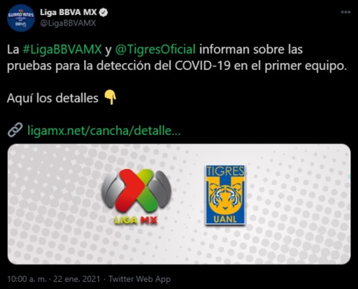 La Liga MX informó que como parte de los protocolos establecidos por las autoridades de salud, el pasado miércoles se realizaron pruebas para detectar casos de COVID-19 en el equipo de Tigres, previo al partido de la J3 del Torneo Guard1anes 2021 ante Atlas, las cuales arrojaron dos resultados positivos.Se realizaron 37 pruebas, indica la Liga MX en un comunicado, de las cuales dos salieron positivas a COVID-19; se trata de un jugador y un elemento del staff técnico de Tigres, por lo que ambos elementos fueron aislados y enviados a sus casas para iniciar un proceso de recuperación.OF
