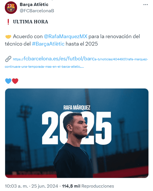 Este martes 25 de junio, el Barcelona B anunció lo que pasará con el técnico mexicano Rafael Márquez, luego de que el Barça Atlètic perdiera en la final por el ascenso a la segunda división ante Córdoba.El Barça reveló en un comunicado la renovación del contrato del exjugador del Atlas de la Liga MX como técnico del equipo filial por una temporada más, hasta el 30 de junio de 2025, con lo que se queda en el futbol español tras rumores que lo ponían fuera.Márquez llevó al Barça Atlètic al play-off de ascenso, donde perdió 2-1 en la final contra el Córdoba. El encuentro se llevó a cabo el pasado domingo en el estadio El Arcángel, ante unos 21 mil aficionados.Rafa Márquez ha dirigido al Barça Atlètic en 82 partidos en 2 temporadas, con saldo de 40 triunfos, 21 empates y 21 derrotas.Tras el resultado, se llegó a rumorar que Grupo Pachuca estaba interesado en los servicios de quien también fue jugador del León tras su paso de 7 años por el Barcelona. Se dijo que buscaban contratarlo para tomar las riendas del Real Oviedo, sin embargo, todo queda descartado tras anunciarse este día su renovación con los catalanes.*Mantente al día con las noticias, únete a nuestro canal de WhatsAppOF