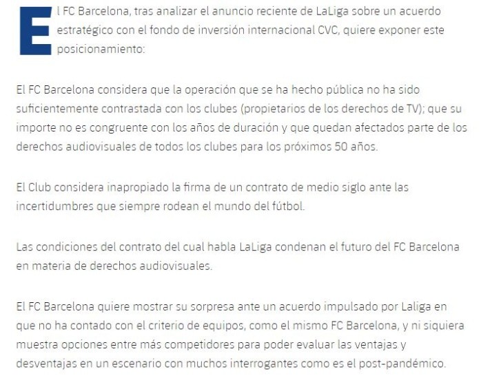 El Barcelona ha emitido este jueves un comunicado en el que el acuerdo de LaLiga con el fondo de inversión internacional CVC, condena el futuro del club azulgrana en materia de derechos audiovisuales.El Barcelona "considera que la operación que se ha hecho pública no ha sido suficientemente contrastada con los clubes (propietarios de los derechos de TV), que su importe no es congruente con los años de duración y que quedan afectados parte de los derechos audiovisuales de todos el clubes para los próximos 50 años".Asimismo, el club azulgrana "considera inapropiado la firma de un contrato de medio siglo ante las incertidumbres que siempre rodean el mundo del fútbol"."Las condiciones del contrato del cual habla LaLiga condenan el futuro del FC Barcelona en materia de derechos audiovisuales", precisa.Para acabar, el club muestra "su sorpresa ante un acuerdo impulsado por LaLiga en que no ha contado con el criterio de equipos, como el mismo FC Barcelona, y ni siquiera muestra opciones entre más competidores para poder evaluar las ventajas y desventajas en un escenario con muchos interrogantes como es el postpandémico". Si quieres tener más contenido, más imágenes y aún más noticias, entonces descarga INFORMAPlus, la aplicación digital de EL INFORMADOR, donde tenemos materiales exclusivos para tí.Descarga la aplicación y pruébala GRATIS por treinta días. Para iOS: https://apple.co/35jaVgbPara Android: https://bit.ly/3gwVSEVSi eres suscriptor de EL INFORMADOR tu acceso está incluido, solicítalo al 33 3678-7777JL