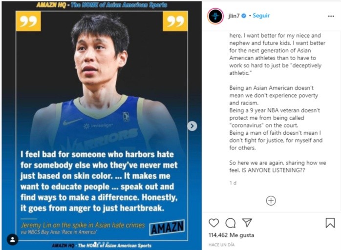 El basquetbolista de los Golden State Warriors en la G-League, Jeremy Lin denunció en sus redes sociales ser víctima de racismo por parte de sus compañeros en la NBA, pues lo llaman ''coronavirus'' debido a su origen asiático.El experimentado jugador Jeremy Lin, nacido en EU, alzó la voz cuando en su cuenta de Instagram publicó una carta para denunciar que ha sido víctima de discriminación y racismo a lo largo de su carrera en la NBA. Explicó que por su ascendencia china había tenido que soportar burlas, y que incluso en un partido llegaron a llamarlo ''coronavirus''.''Algo está cambiando en esta generación de asiático-americanos. Estamos cansados de escuchar que no experimentamos el racismo. Estamos cansados de bajar la cabeza y no meternos en problemas. Estamos cansados de que se rían e imiten nuestros ojos, de ser considerados objetos exóticos o de escuchar que somos irremediablemente feos'', dice el texto de Jeremy Lin.Y continúa: ''Ser un veterano de nueve años en la NBA no me protege de que me llamen 'coronavirus' en la cancha. Ser un hombre de fe no significa que no luche por la justicia, ni por mí ni por los demás. Así que aquí estamos de nuevo, compartiendo cómo nos sentimos. ¿ALGUIEN ESTÁ ESCUCHANDO?''.Jeremy Lin espera que haya cambios para que jugadores de generaciones futuras no sufran lo mismo que él. ''Quiero algo mejor para mis mayores que trabajaron tan duro y se sacrificaron tanto para ganarse la vida aquí. Quiero algo mejor para mi sobrina y mi sobrino y futuros hijos. Quiero algo mejor para la próxima generación de atletas asiático-americanos que tener que trabajar tan duro para ser simplemente 'engañosamente atlético'. Ser un asiático-americano no significa que no experimentemos la pobreza y el racismo''.OF