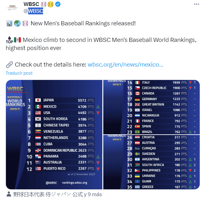 Ayer jueves 2 de noviembre se dio a conocer un hito en la historia del deporte mexicano. Se reveló el ranking actual de selecciones nacionales de beisbol, y tras lo conseguido por el Tricolor en el Clásico Mundial 2023 y los Juegos Panamericanos de Santiago, México subió al segundo lugar del ranking mundial de la Confederación Mundial de Beisbol y Softbol, y ¡supera a Estados Unidos!Los grandes resultados de la novena mexicana que le valió en los más recientes eventos la medalla de bronce de Santiago 2023, puso a México sólo detrás de Japón, que lidera la lista de la WBSC (por sus siglas en inglés) con 5 mil 572 puntos.La Selección Mexicana de beisbol tiene 4 mil 709 unidades; son 217 más que Estados Unidos, que bajó al tercer sitio; y Corea del Sur descendió al cuarto puesto, con una puntuación de 4 mil 186.*Mantente al día con las noticias, únete a nuestro canal de WhatsApp OF