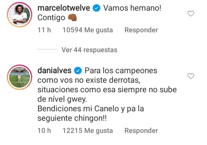 Luego de que Saúl "Canelo" Álvarez fuera vencido por Dmitry Bivol, casi 10 años después de la que hasta ahora era la única derrota en su carrera ante Floyd Mayweather Jr., las muestras de cariño y los mensajes de aliento para el tapatío no se han hecho esperar. En ese sentido, fueron dos jugadores del Real Madrid y Barcelona respectivamente, quienes se sumaron al apoya para "Canelo" Álvarez. El tapatío publicó una foto en sus redes sociales señalando que el boxeo es así, a veces se puede ganar y a veces se puede perder, sin embargo, "Canelo" resaltó el gran espectáculo que ofrecieron a la gente que se dio cita en la T-Mobile Arena de Las Vegas.Tras este mensaje, Marcelo, lateral izquierdo y estrella del Real Madrid y Dani Alves, lateral y leyenda del Barcelona, mostraron su apoyo para el "Canelo" con mensajes de ánimos. "Vamos hermano. Contigo", fue lo que le escribió el jugador de los merengues. Por su parte, el futbolista blaugrana se mostró más expresivo e incluso hizo gala de su excelente español al más puro estilo de México. "Para los campeones como tú no existen derrotas, situaciones como esa siempre no sube de nivel. Bendiciones mi 'Canelo'", escribió Dani Alves. Otras estrellas del deporte también han mandado sus mensajes de apoyo para un "Canelo" que seguramente ya estará pensando en la siguiente pelea. JL