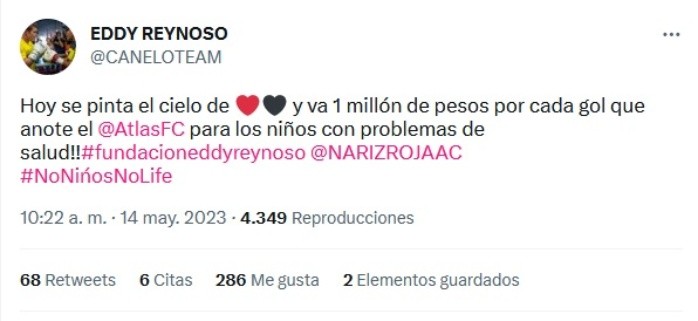 Eddy Reynoso, entrenador del pugilista Saúl “Canelo” Álvarez, campeón jalisciense, no ha ocultado su lado rojinegro, nunca lo hará y para demostrar su amor por los colores del Atlas, este domingo publicó en su cuenta oficial de Twitter que durante el Clásico Tapatío de este domingo, estará apoyando a quienes más lo necesitan.Y es que por cada gol que logre hacer la Academia, “Canelo Team” donará un millón de pesos ($1,000,000) para niños con problemas de salud.“Hoy se pinta el cielo de ❤ y va 1 millón de pesos por cada gol que anote el @AtlasFC para los niños con problemas de salud!! #fundacioneddyreynoso @NARIZROJAAC #NoNińosNoLife”, escribió Eddy Reynoso en sus redes sociales.Es sabido que Santos Saúl Álvarez Barragán es aficionado del Guadalajara; sin embargo, cuando Atlas logró el bicampeonato, el “Canelo” no dudó en apoyar a su entrenador y amigo portando la playera rojinegra en un palco del Estadio Jalisco. Y si bien fue criticado por un sector de aficionados al futbol, otro sector lo apoyó y más cuando existen ayudas de este tipo para niños que tanto lo necesitan.JM