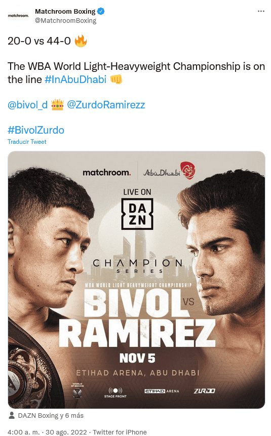 Se ha hecho oficial que el boxeador mexicano Gilberto "Zurdo" Ramírez (44-0, 30 KO's) será el rival del ruso Dmitry Bivol (20-0, 11 KO's), quien expondrá el cinturón semipesado de la Asociación Mundial de Boxeo (AMB) el 5 de noviembre.Se trata del título que el ruso defendió exitosamente en mayo frente a Saúl "Canelo" Álvarez, quien fracasó en su intento por volver a coronarse dentro de esa división. El combate entre Bivol y Ramírez se llevará a cabo en Emiratos Árabes Unidos."Estoy muy contento, porque finalmente se llevará a cabo esta pelea", aseguró el mexicano, nativo de Mazatlán, Sinaloa. "He esperado por esto durante mucho tiempo y la del 5 de noviembre será una gran noche. Podría pelear contra Bivol donde fuera, incluso en Marte, pero será un gran espectáculo en Abu Dhabi. Estoy muy agradecido por esta oportunidad".Más parco, muy a su estilo, el campeón ruso recuerda que se ha hablado mucho sobre este combate y en cuanto a si Ramírez tiene la capacidad de lograr lo que no pudo "Canelo"."La pelea contra el 'Zurdo' se ha venido manejando desde hace tiempo, se han dicho muchas cosas al respecto", subraya Bivol. "Ahora tendremos la oportunidad de vernos frente a frente y respaldar todo eso con acciones, que la palabras se queden fuera del ring".OF