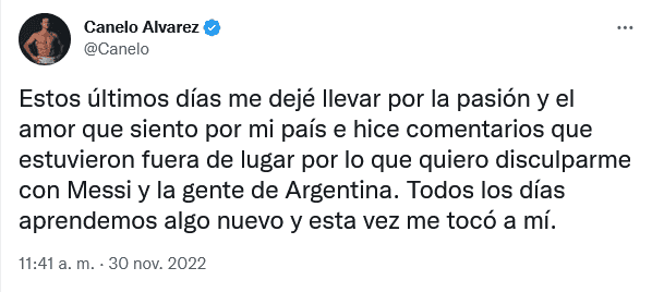 Saúl "Canelo" Álvarez ha sido tendencia los últimos días después de que la Selección de Argentina derrotara a México en el segundo partido del Grupo C del Mundial de Qatar 2022, pero no por el resultado del partido.El boxeador jalisciense señaló en sus redes sociales que después de la derrota, el "10" de la albiceleste, Lionel Messi, había pateado la camiseta de la Selección Mexicana y tras eso, fue blanco de comentarios negativos por considerarlo algo exagerado o sacado de contexto, y de quienes estaban a su favor.Sin embargo, hoy volvió a sus redes sociales para ofrecer una disculpa tanto a Messi como a la gente de Argentina:"Estos últimos días me dejé llevar por la pasión y el amor que siento por mi país e hice comentarios que estuvieron fuera de lugar por lo que quiero disculparme con Messi y la gente de Argentina. Todos los días aprendemos algo nuevo y esta vez me tocó a mí", dijo en su cuenta de Twitter.Muchos jugadores y personajes del medio deportivo criticaron la reacción del Canelo Álvarez, señalando que el pugilista no conoce la manera en la que se vive en un vestidor después de un partido, y defendiendo a Messi de los comentarios.Por otro lado, ciudadanos argentinos incluso propusieron que el pleito se definiera, pero con un boxeador, para lo que sugirieron el regreso de Marcos El Chino Maidana al ring.OF