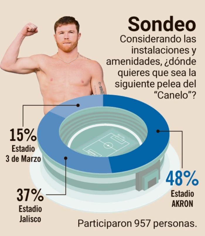 Es un hecho: Saúl “Canelo” Álvarez regresará a Jalisco para disputar su tradicional pelea del mes de mayo. Álvarez, quien no pelea en territorio nacional desde 2011 cuando se midió a Kermit Cintron en la plaza de Toros México, volverá a subir al encordado dentro de esta Entidad para unirse a los festejos por los 200 años de Jalisco como Estado libre y soberano.La fecha exacta, el lugar y el rival aún están por definirse, pero a falta de que todo esto se dé a conocer, el pugilista dio su palabra para regresar a la tierra que lo vio nacer. “Estoy listo para regresar a mi casa y defender mis títulos en el lugar donde nací y donde inició mi historia, con la gente que siempre me ha apoyado. En mayo de este año voy a pelear por Jalisco y celebrar contigo la grandeza de nuestra tierra”, comentó el pugilista en un video difundido por el Gobierno del Estado.A falta de que se haga oficial el lugar en donde podría ser la pelea, escenarios como el estadio Jalisco o el estadio Akron aparecen como posibles sedes, esto además de que John Ryder se perfila como el rival del tapatío.Hace algunas semanas la Ciudad de México aparecía como otra de las opciones viables para “Canelo” en su regreso a territorio nacional, pero a final de cuentas será Jalisco la entidad en donde Álvarez dispute su pelea número 63 como profesional.Más de una década sin pelear en MéxicoLa última vez que Saúl Álvarez se presentó en territorio mexicano fue el 26 de noviembre del 2011, para enfrentar a Kermit Cintron en la monumental plaza de toros México.En aquella ocasión, el mexicano mostró su poderío y logró noquear a su rival en el quinto episodio, resultado que le permitió mantener el cinturón de campeón de peso wélter del Consejo Mundial de Boxeo.Luego de esa aparición en México, “Canelo” Álvarez ha peleado en 22 ocasiones en los Estados Unidos, teniendo como sedes principales Las Vegas y Texas.Álvarez tiene 58 victorias, 39 de ellas por la vía rápida, y dos derrotas, la más reciente de ellas ante el ruso Dmitrii Bivol.Luego, el mexicano venció al kazajo Gennadiy Golovkin en septiembre del año pasado para confirmarse como el mejor peso Medio de la actualidad.Con información de AgenciasLa cifra22 peleas ha protagonizado Saúl “Canelo” Alvarez desde que tuvo un combate por última vez en México. El 26 de noviembre de 2011 enfrentó a Kermit Cintrón, en la plaza de toros México.Luego de la confirmación de la pelea del “Canelo” Álvarez en Jalisco, como parte de las celebraciones por los 200 años de que Jalisco se constituyó como Estado libre y soberano, los aficionados tapatíos al boxeador expresaron su sentir y emoción por el evento.Desde hace días que comenzó a circular la noticia de la posible pelea, también se plantearon varios escenarios que podrían recibir el regreso del “Canelo”, siendo el Estadio AKRON, uno de ellos. En un sondeo publicado ayer en el sitio web www.informador.mx, de 957 participantes, 48% expresaron su deseo de que, por las instalaciones y amenidades del inmueble, sea el estadio de las Chivas donde se celebre la pelea. A través de redes sociales también hubo quien comentó que el AKRON sería la mejor elección:“¡Que sea en el AKRON! Está mucho más fácil llegar y tiene estacionamiento”.“En el estadio AKRON, ahí hay estacionamiento y siempre está limpio”.El estadio, que ha sido sede de varios conciertos y ha sido designado sede mundialista para 2026, cuenta con una capacidad para albergar a más de 45 mil espectadores y cuenta con estacionamiento en el lugar.