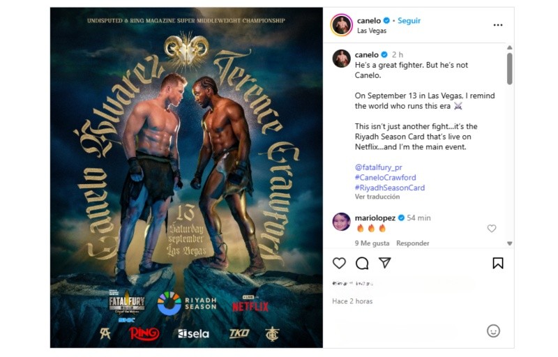 La pelea de boxeo más esperada del año, Saúl "Canelo" Álvarez vs Terence Crawford, ya tiene sede: el combate será en Las Vegas el sábado 13 de septiembre, después de que se especulaba que tendría lugar en Arabia Saudita.La pelea por el campeonato unificado de peso supermediano es parte del acuerdo de al menos cuatro peleas del Canelo Álvarez con Riyadh Season, valorado en 400 millones de dólares. Una de esas peleas puede ser en otro lugar, y Las Vegas se ha convertido en el hogar del boxeo para el campeón mexicano.Riyadh Season está trabajando con el director general de UFC, Dana White, para promover la pelea. Este es el primer intento de White en el boxeo como parte de un esfuerzo por convertirse en un jugador importante en el deporte."¿Estás bromeando que la primera pelea de boxeo que voy a promocionar es Canelo vs. Crawford? Es literalmente una pelea única en la vida", afirmó White en un comunicado.El Canelo Álvarez (63-2-2) unificó la división al derrotar a William Scull por decisión unánime en Riad, Arabia Saudita, el pasado 3 de mayo. Crawford, quien es de Omaha, Nebraska, asistió a esa pelea, y el campeón de cuatro divisiones, que tiene un récord de 41-0, anunció en el ring con Álvarez que se enfrentarían en septiembre."Estoy listo para demostrar una vez más que soy el mejor peleador libra por libra del mundo", expresó Álvarez en un comunicado."Mi récord perfecto habla por sí mismo. Soy el mejor peleador del mundo y sin importar el oponente o la categoría de peso, siempre he salido victorioso. El 13 de septiembre, mi mano se levantará una vez más mientras el mundo observa la grandeza", añadió Crawford. *Mantente al día con las noticias, únete a nuestro canal de WhatsAppOF