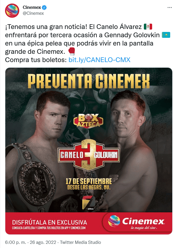 La rivalidad entre el mexicano Saúl "Canelo" Álvarez y Gennady Golovkin llegará a la pantalla grande.Pero no porque se trate de una película o documental, sino porque en las salas de cine de la empresa Cinemex estarán transmitiendo la tercera pelea entre el tapatío y el kazajo.Con la señal de TV Azteca, en distintas salas de cine del país estará pasando el combate que vaya que se ha calentado en las conferencias previas.Cabe recordar que Canelo vs Golovkin III se realizará por la noche del sábado 17 de septiembre en Las Vegas.OF