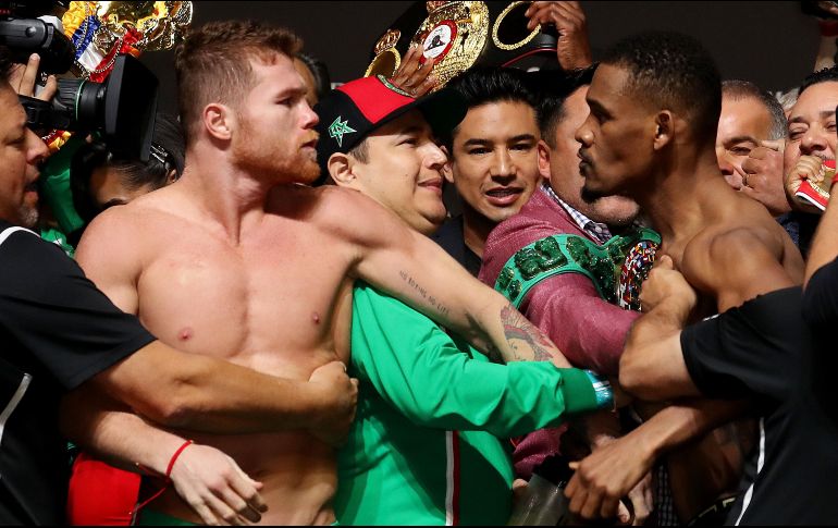 Saúl "Canelo" Álvarez y el estadunidense Daniel Jacobs explotaron tras cumplir en el pesaje y si ya se esperaba una pelea emocionante, las cosas quedaron muy calientes en la T-Mobile Arena.Tras la gira promocional, diversas conferencias y la semana de la pelea las cosas parecían con total cordialidad de ambas partes, pero luego de subir a la báscula en la T-Mobile Arena, sede de la pelea el sábado, explotaron.Ante cientos de personas que se dieron cita, los protagonistas del pleito unificatorio se declararon en condiciones de estelarizar la velada, el "Canelo" con 159.5 libras y Jacobs con 160.En el frente a frente se mostraron retadores, aunque lo de Jacobs fue más evidente tras lanzar prácticamente un cabezazo, a lo que el mexicano respondió con un empujón que obligó a la intervención de sus equipos y que dejó caliente la situación para la pelea del sábado."Canelo" pondrá en juego los títulos de peso medio del CMB y de la AMB, mientras que Jacobs expondrá el de la FIB; también se jugarán el "Cinturón maya" del organismo verde y oro.RR